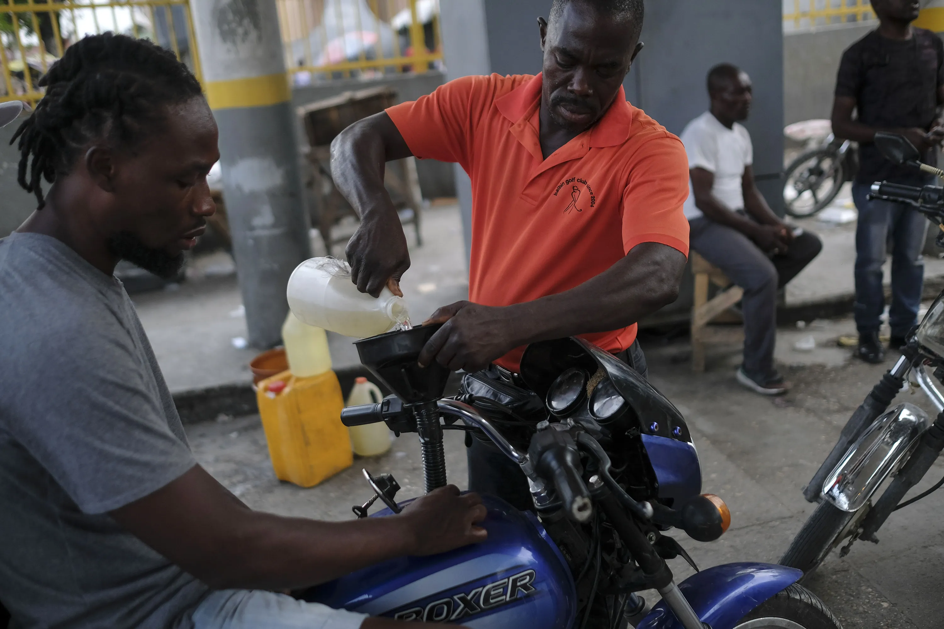 A man pours a small amount of gasoline into a motorcycle's fuel tank amid gas shortages during the general strike in Port-au-Prince, Haiti, Monday, October 18, 2021. (Photo by Matias Delacroix/AP Photo)