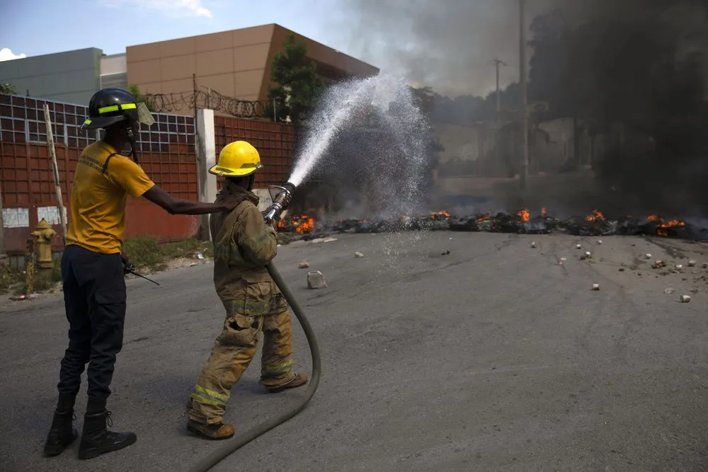 Firefighters douse water on a burning roadblock set by protesters in Port-au-Prince, Haiti, Monday, October 18, 2021. (Photo by Joseph Odelyn/AP Photo)