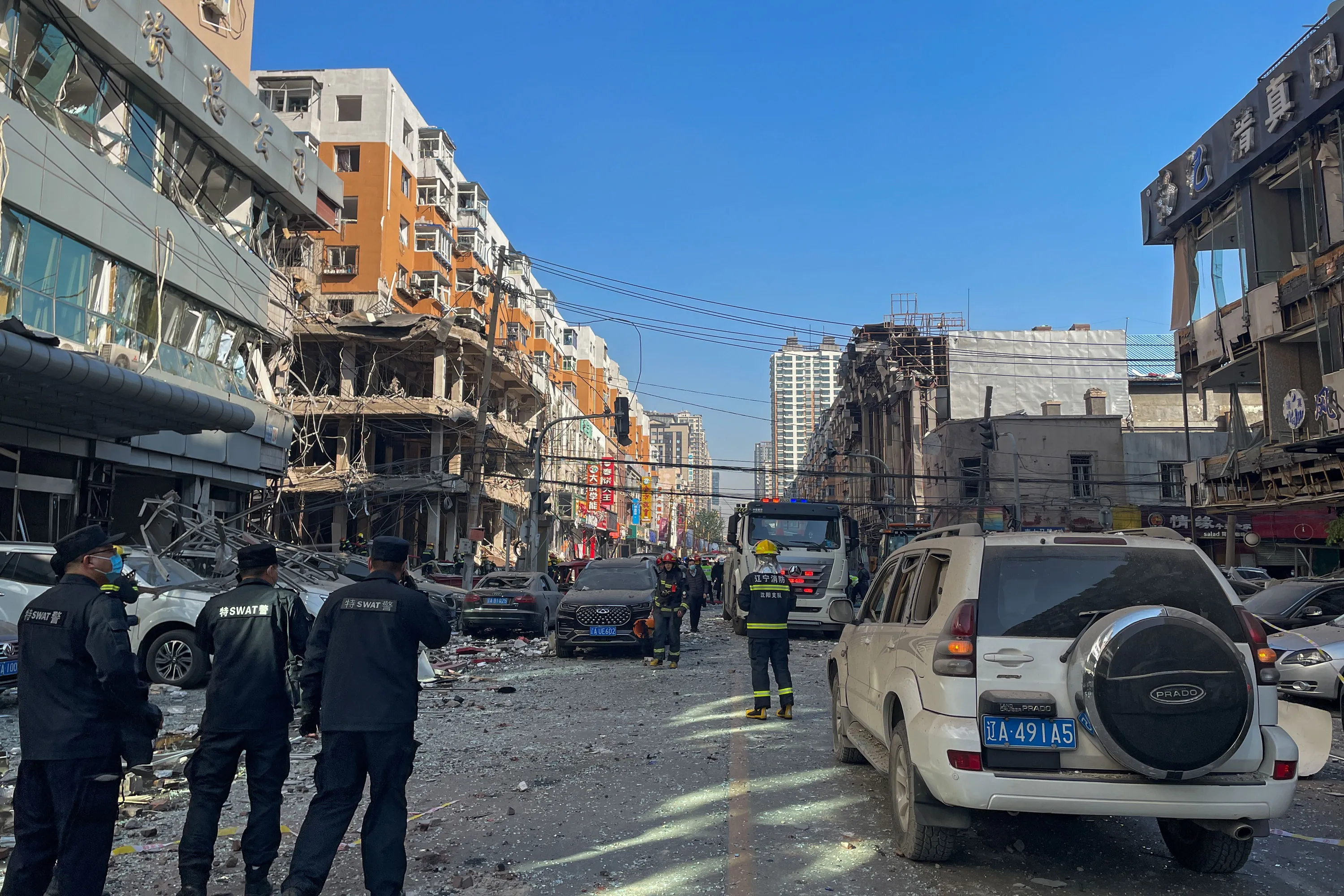 In this photo released by Xinhua News Agency, policemen and firefighters walk through damaged shophouses following an explosion in Shenyang in northeastern China's Liaoning Province, Thursday, October 21, 2021. Several people were killed and over dozen injured in a gas explosion at a restaurant in northeastern Chinese city Shenyang Thursday morning, according to local authorities. (Photo by Cai Xiangxin/Xinhua via AP Photo)