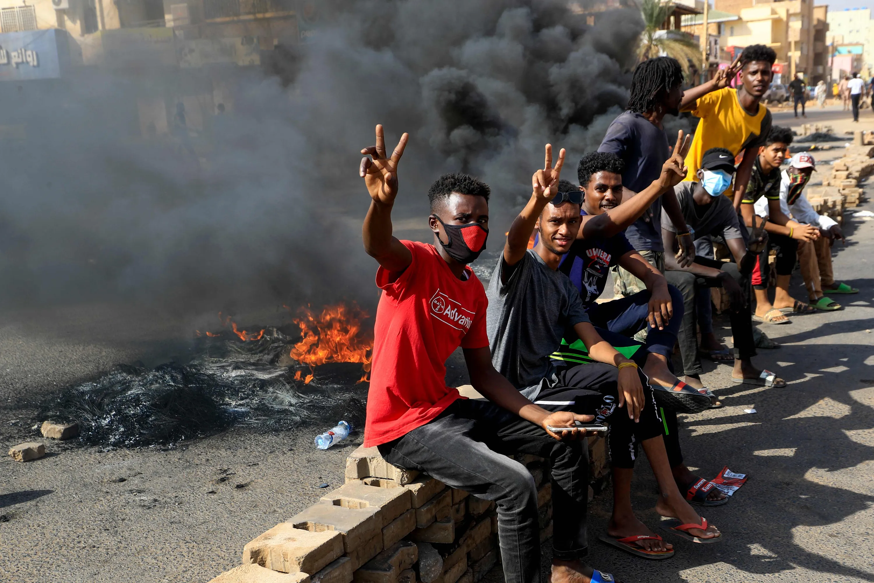 Sudanese protesters flash the V for victory sign as they burn tyres to block a road in 60th Street in the capital Khartoum, to denounce overnight detentions by the army of members of Sudan's government, on October 25, 2021. Armed forces detained Sudan's Prime Minister over his refusal to support their “coup”, the information ministry said, after weeks of tensions between military and civilian figures who shared power since the ouster of autocrat Omar al-Bashir. (Photo by AFP Photo/Stringer)