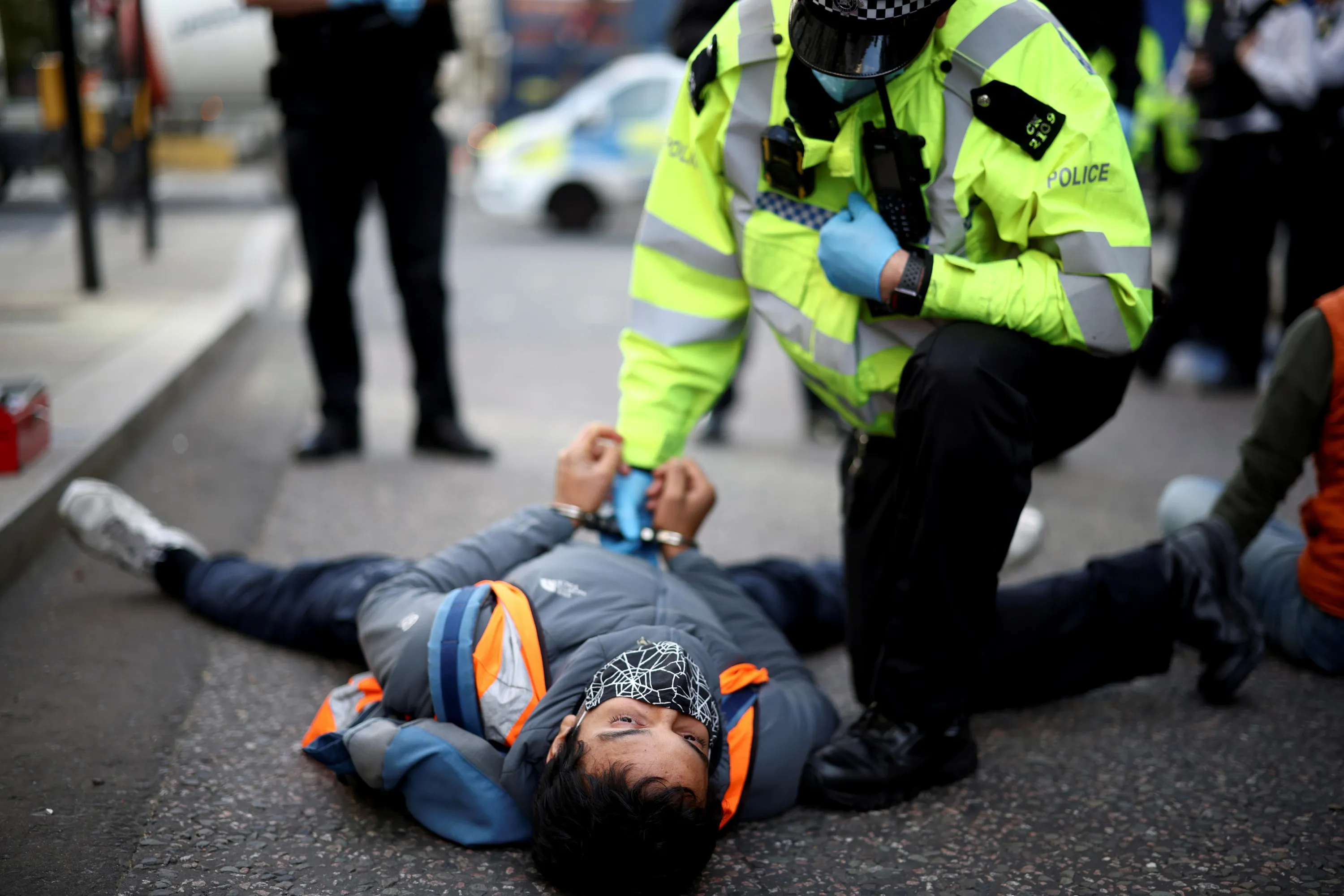 A police officer detains an Insulate Britain activist lying on the road during a protest in London, Britain on October 25, 2021. (Photo by Henry Nicholls/Reuters)