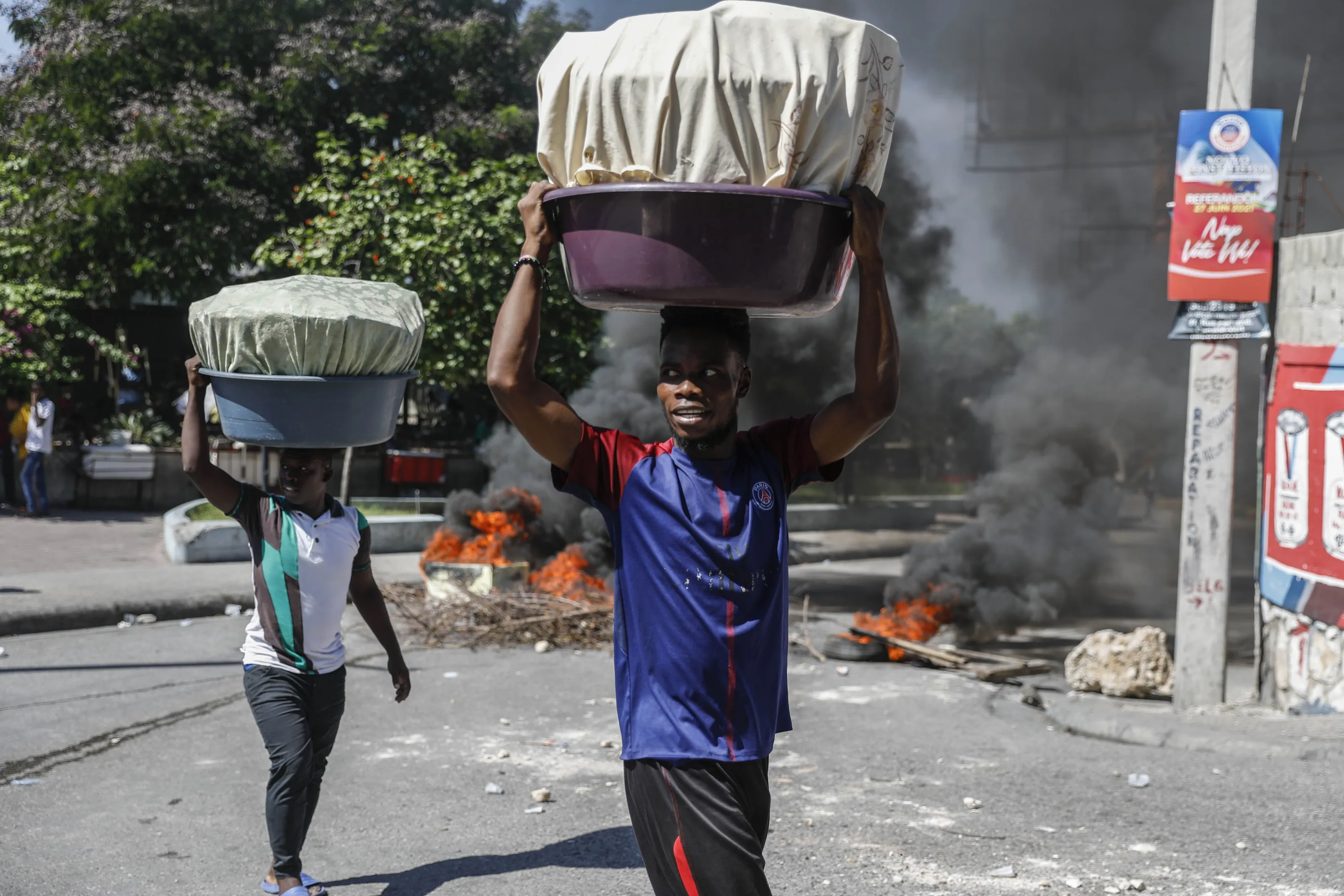 Street vendors walk past a burning road block set by anti-government protesters in Port-au-Prince, Haiti, Thursday, October 21, 2021. Demonstrators decry a severe fuel shortage and a spike in insecurity as they demanded that Prime Minister Ariel Henry step down. (Photo by Joseph Odelyn/AP Photo)