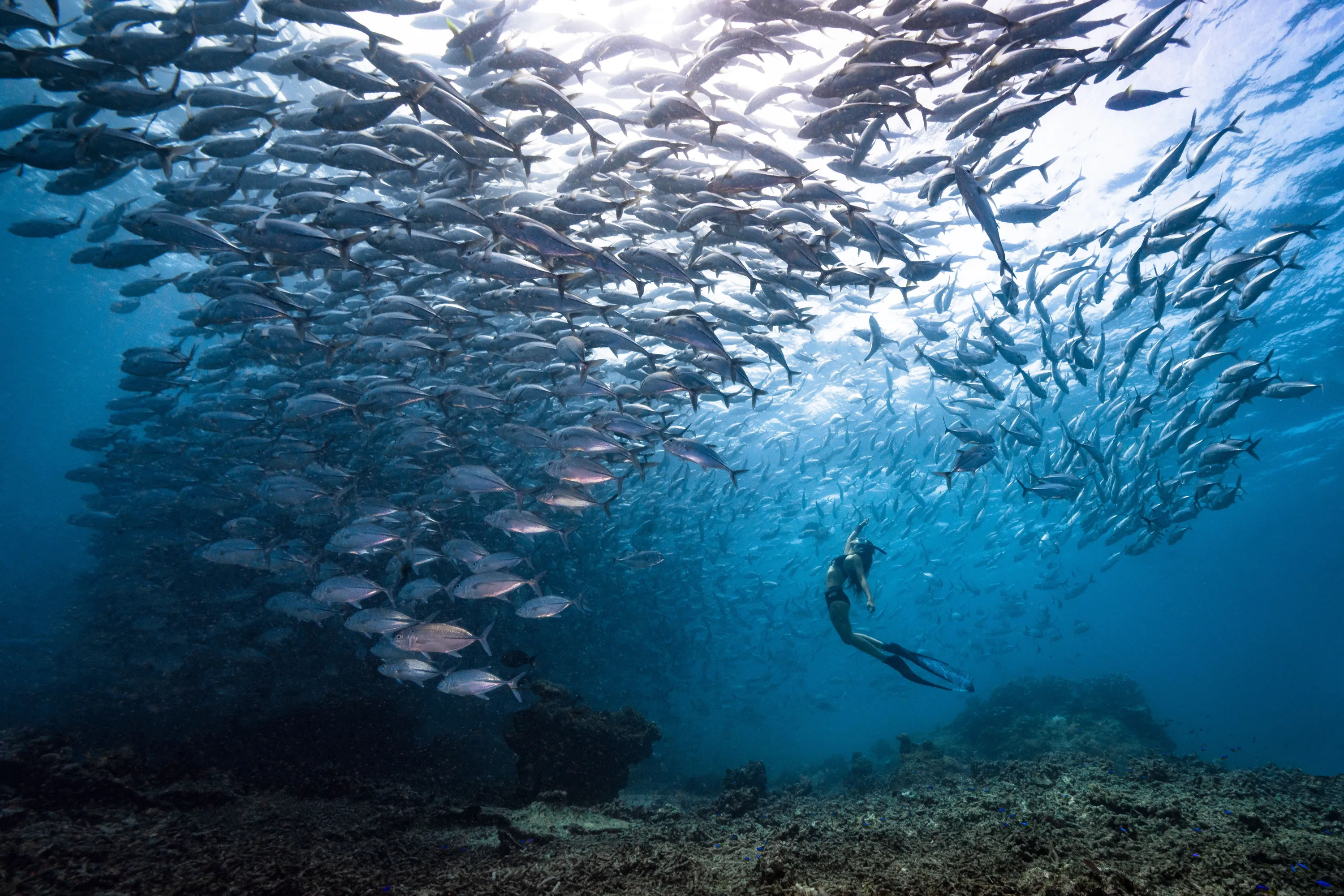 Fish Tornado. A freediver dives into a school of jackfish, at one of the most beautiful islands in the world, Sipadan. “My wife is a skilled free diver, as we visited the amazing Sipadan Island of Malaysia, I dived under the water and waited for her to dive towards the middle of the jackfish repeatedly, until I got this beautiful shot of her surrounded with storm of jackfish”. (Photo by Khai Chuin Sim/SIPA Contest)