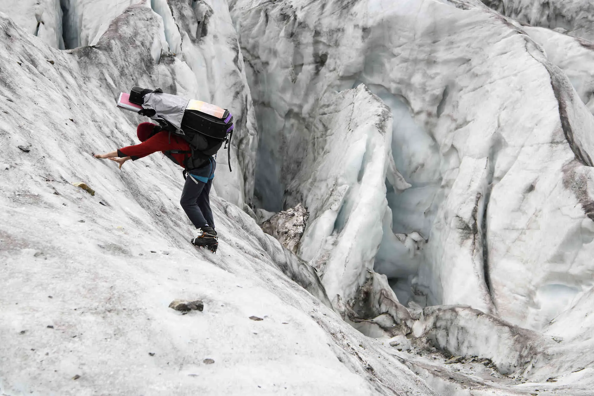 Florian Vella, Guitar, from left, of the French Band Tournee des Refuges, walks his musical instruments on his back, on the Gorner Glacier (Gornergletscher) towards the Monte Rosa Hut (2883m), during the Zermatt Music Festival and Academy, above Zermatt, Switzerland, on Thursday, 16 September 2021. (Photo by Anthony Anex/Keystone via AP Photo)