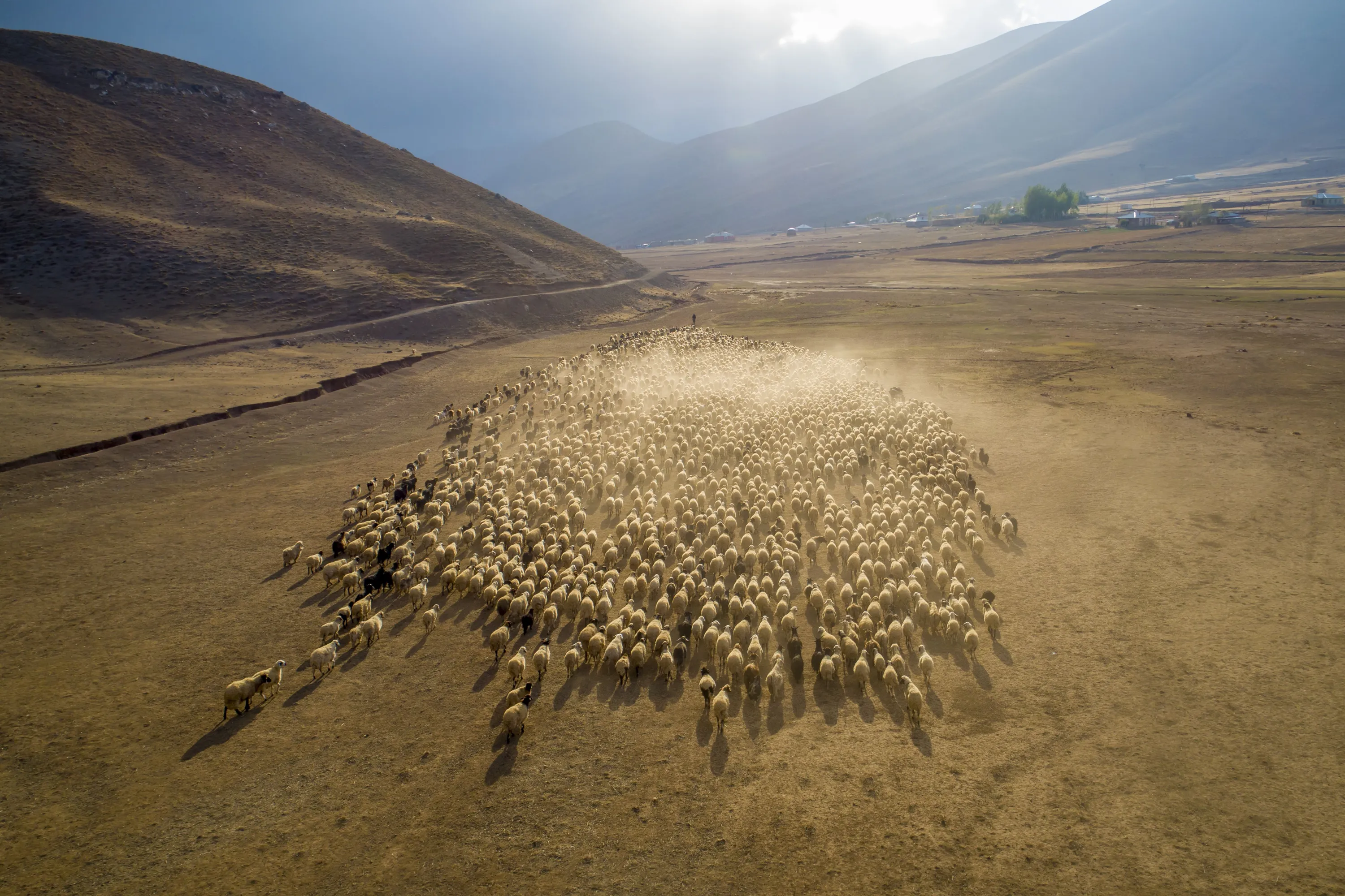 A drone photo shows an aerial view of a flock of sheep on their way with breeders to back warmer places in Catak district of Turkey's southeastern province Van on September 24, 2021. Flocks of sheep being brought down from highlands by stock breeders to warmer stockyards before winter season. (Photo by Ozkan Bilgin/Anadolu Agency via Getty Images)