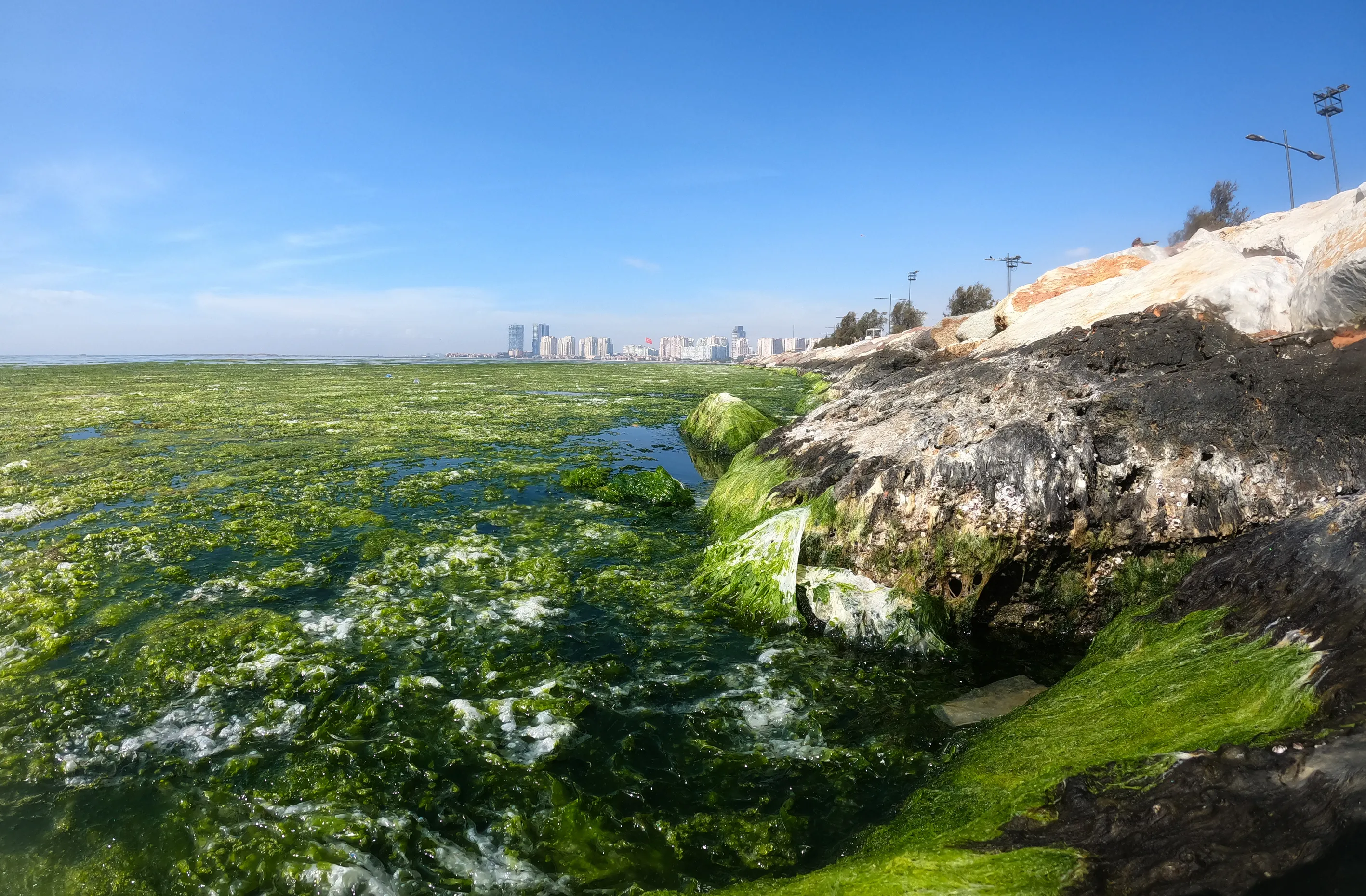 A view of Bostanli coast covered with sea ââlettuce (Ulva lactuca) spreading in Gulf of Izmir, Turkey on October 10, 2021. Sea lettuce, which grows due to the increasing of nitrogen and phosphorus because of water pollution, covered water surface of the lagoon, which hosts bird species, as well as the northern shores of the bay. (Photo by Mahmut Serdar Alakus/Anadolu Agency via Getty Images)