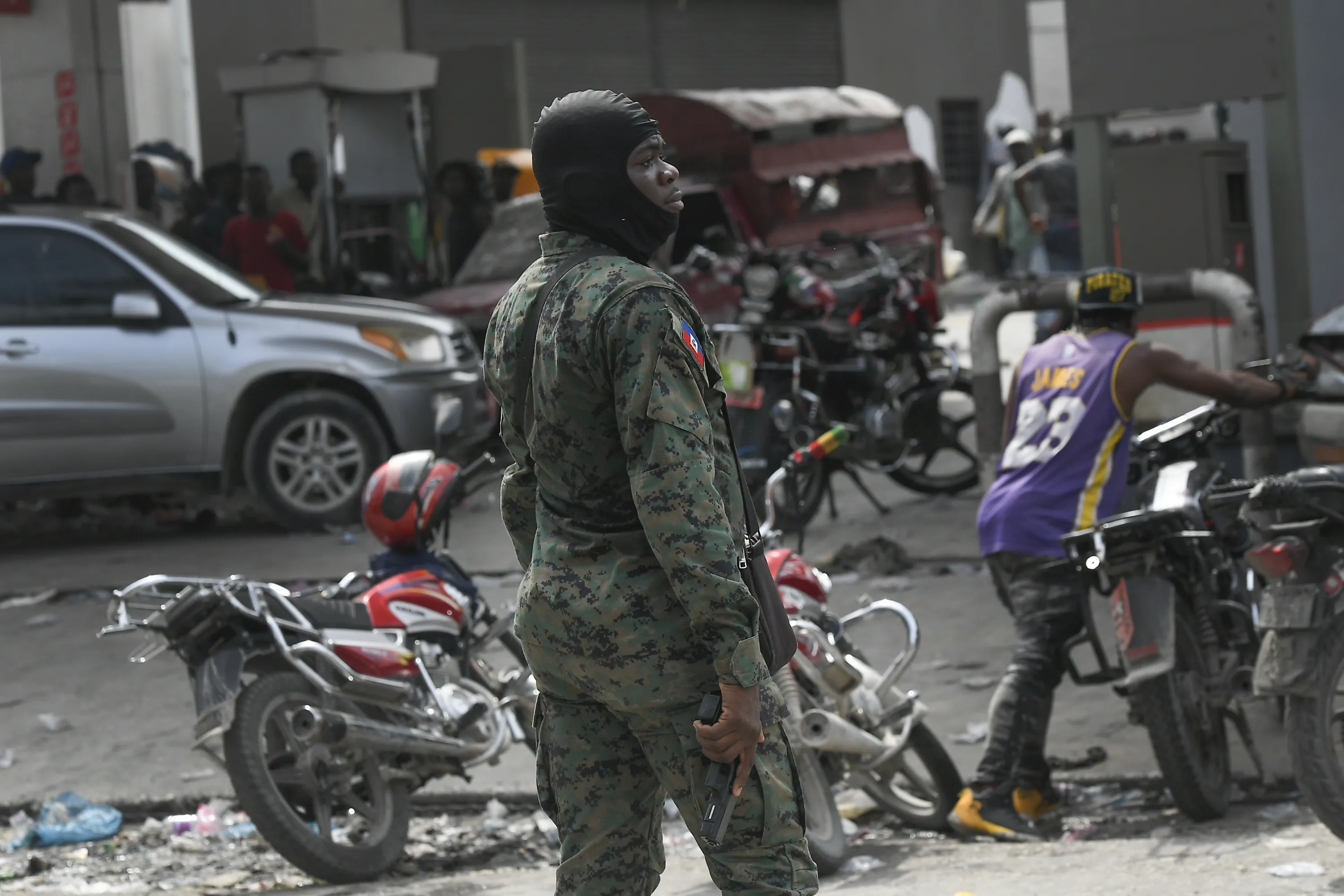 An armed police officer stands outside a gas station after police shot bullets into the air to disperse a crowd threatening to burn down the gas station because the crowd believed the station was withholding gas, in Port-au-Prince, Haiti, Saturday, October 23, 2021. (Photo by Matias Delacroix/AP Photo)