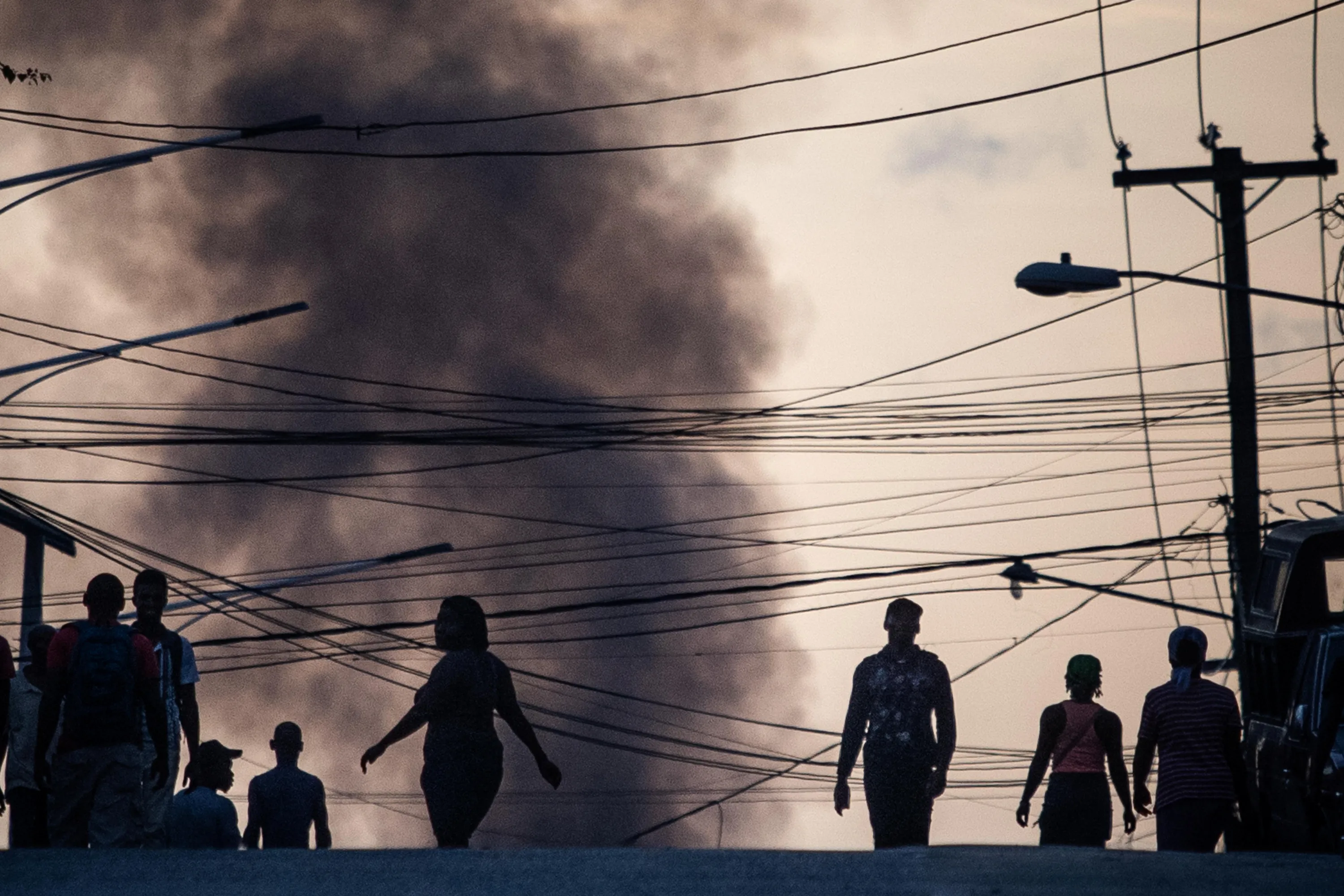 Residents walk in front of a plume of smoke during fuel shortages in Port-au-Prince, Haiti, October 26, 2021. (Photo by Adrees Latif/Reuters)