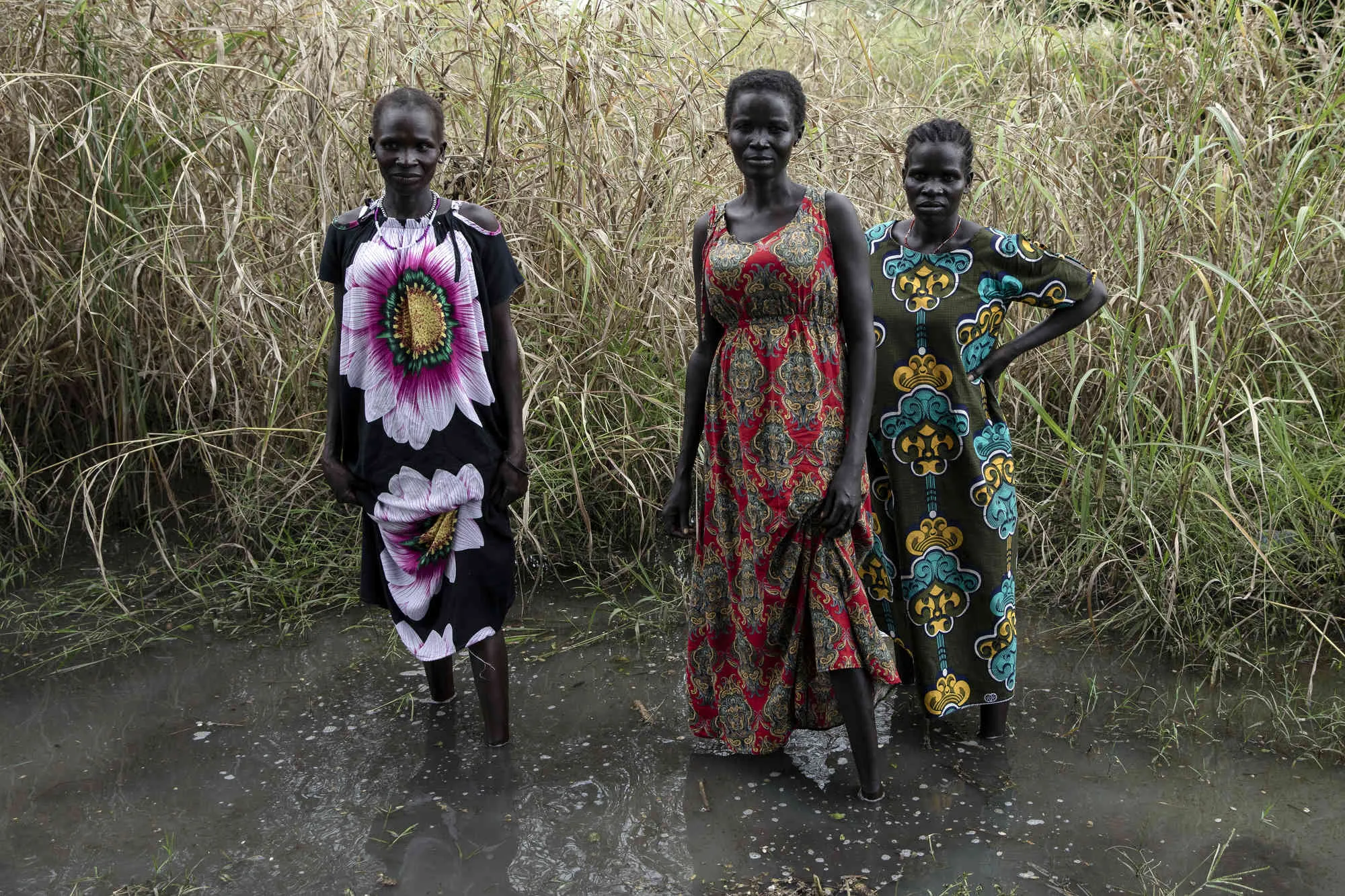 Three women pose for a portrait with their feet in the water, in Dijeri village, on the outskirts of Juba, South Sudan, Friday, October 1, 2021. Dijeri was flooded for a week when the waters receded at the end of September. It is the second year in a row that river Luri floods the village. Floods have displaced around 426,000 people across the country since May, according to the U.N humanitarian affairs office. (Photo by Adrienne Surprenant/AP Photo)