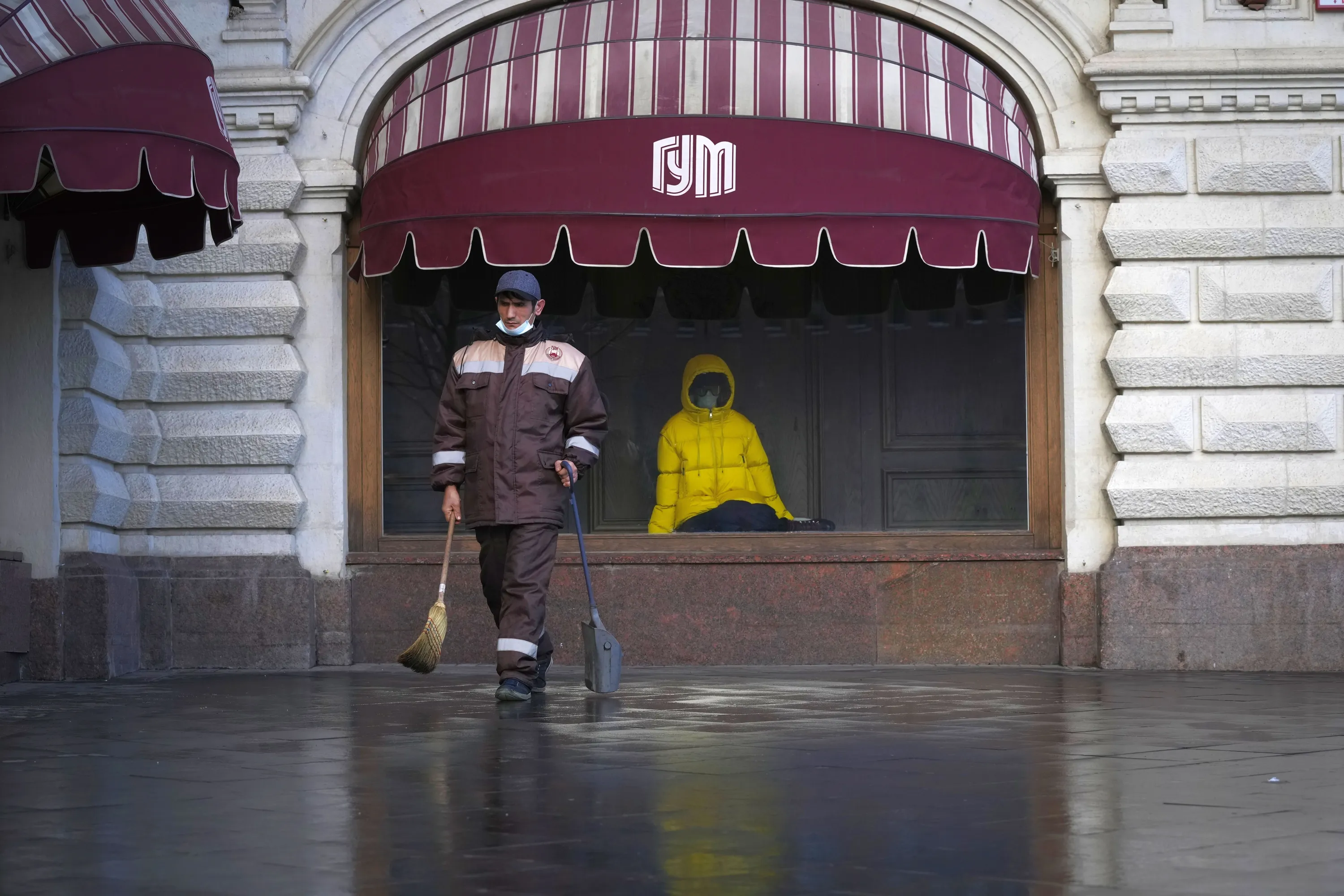 A municipal worker walks past a window of GUM, the State Shop in Red Square, closed due to the coronavirus in Moscow, Russia, Thursday, October 28, 2021. Moscow followed Thursday, shutting kindergartens, schools, gyms, entertainment venues and most stores, and allowing restaurants and cafes to only provide service for takeout or delivery. The number of new daily cases in Russia rose by over forty thousand on Thursday, topping a previous record reached earlier this week. The government hopes that the nonworking period will help curb the spread by keeping most people out of offices and public transportation. (Photo by Alexander Zemlianichenko/AP Photo)