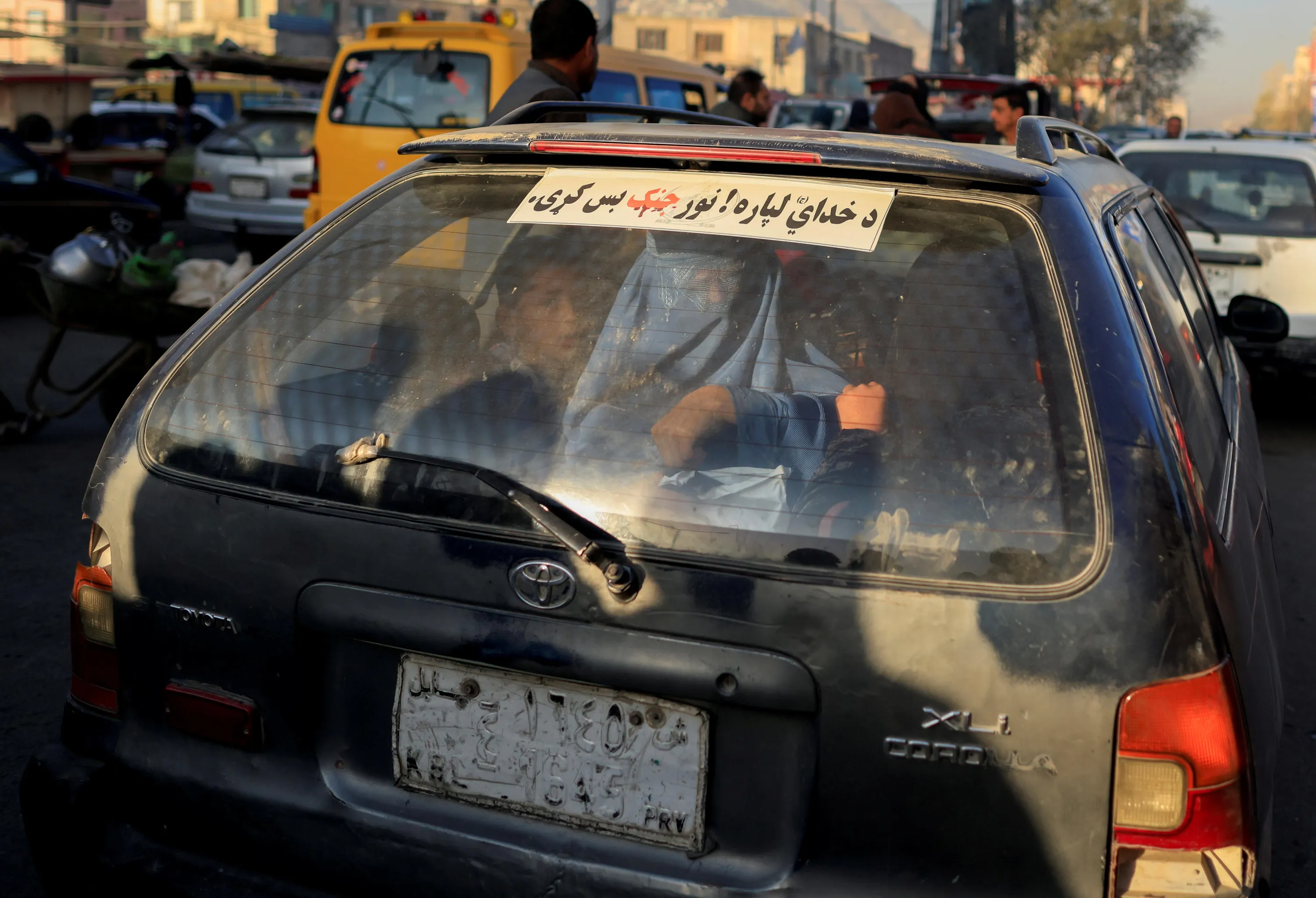 A woman wearing a burqa sits in the trunk of a taxi in Chawok market in Kabul, Afghanistan, October 14, 2021. The sticker reads “for God sake stop fighting”. (Photo by Zohra Bensemra/Reuters)
