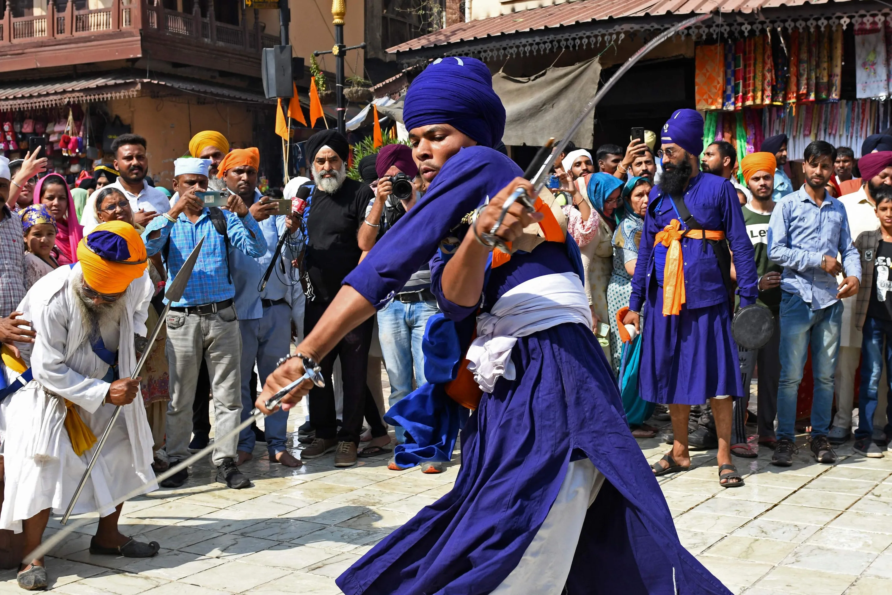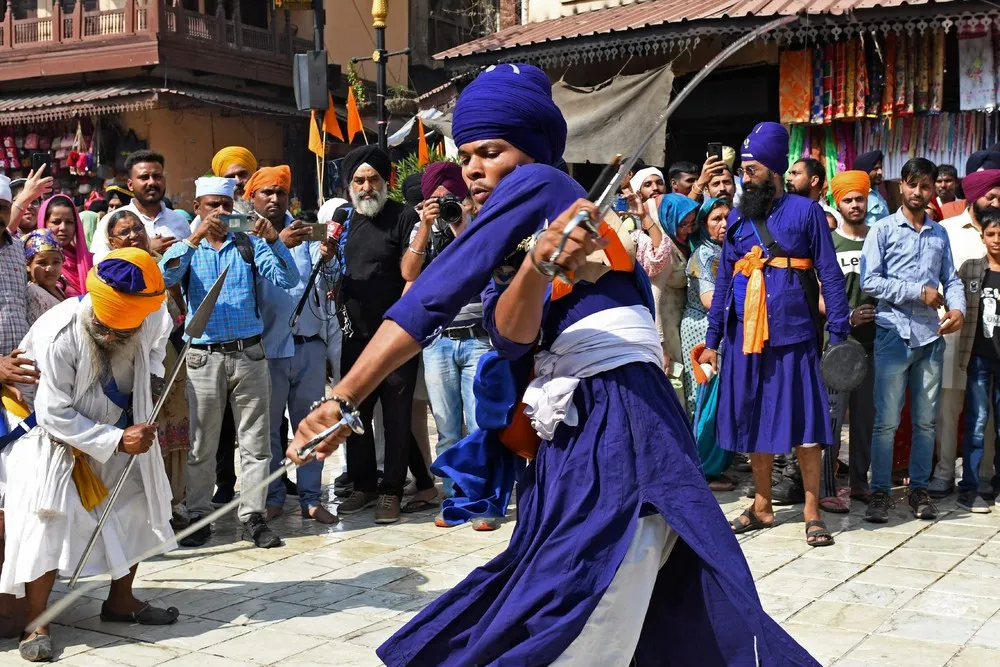 A Nihang or Sikh warrior performs “Gatka”, an ancient form of Sikh martial arts, during a religious procession on the eve of the birth anniversary of the fourth Sikh Guru Ram Das outside the Golden Temple in Amritsar on October 21, 2021. (Photo by Narinder Nanu/AFP Photo)