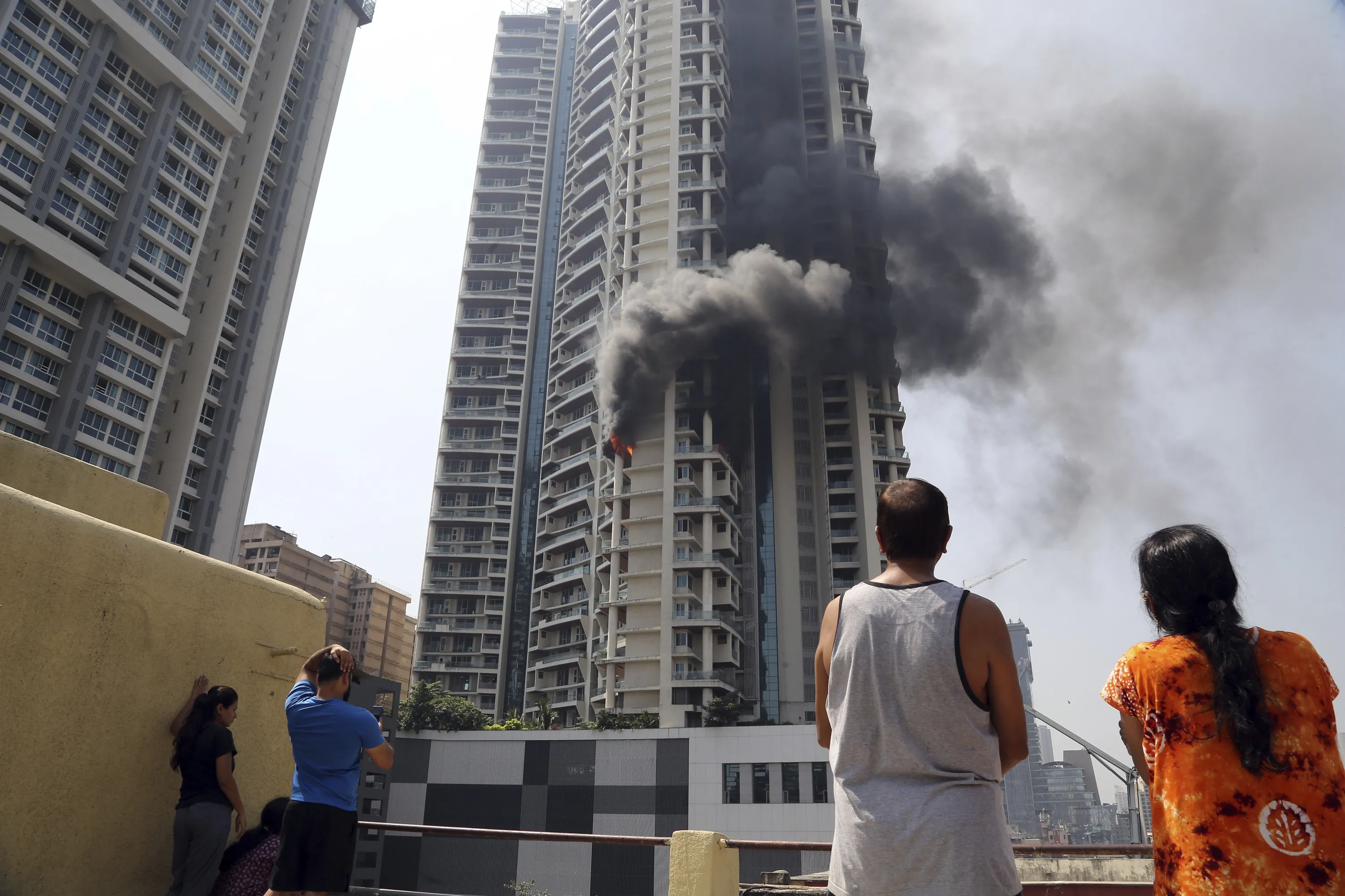 People watch a fire in a 61-story luxury apartment building in Mumbai, India, Friday, October 22, 2021. Television images showed heavy black smoke billowing into the sky from the 19th floor apartment on Curry Road in south Mumbai, India's financial and entertainment capital. Fires are common in India, where building laws and safety norms are often flouted by builders and residents. (Photo by AP Photo/Stringer)