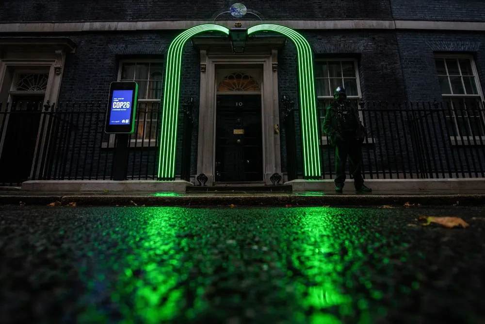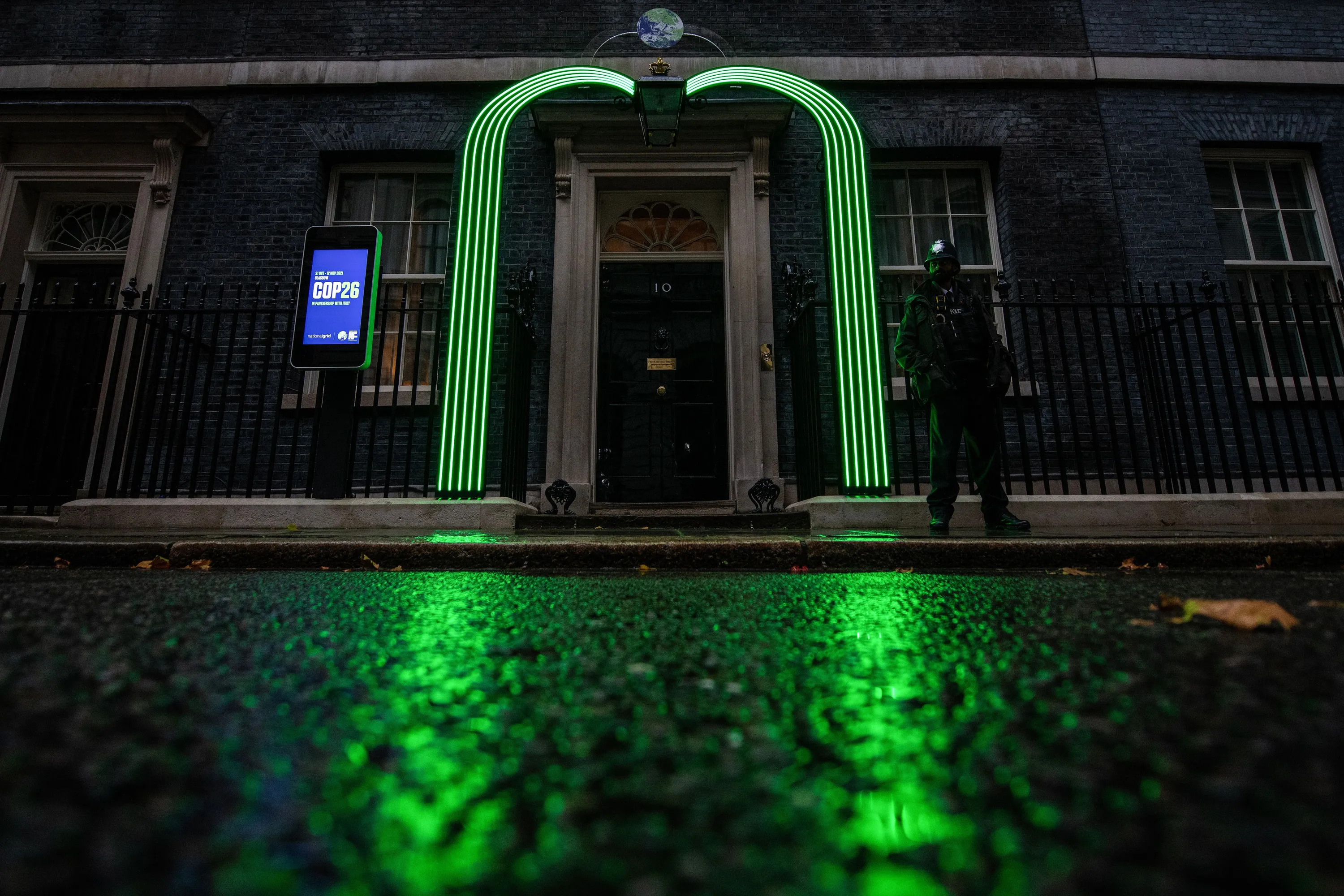 A green arch is lit over the door of number 10 Downing Street in London on October 29, 2021 in preparation for the COP26 summit which will be taking place in Glasgow. (Photo by Chris J. Ratcliffe/AFP Photo)