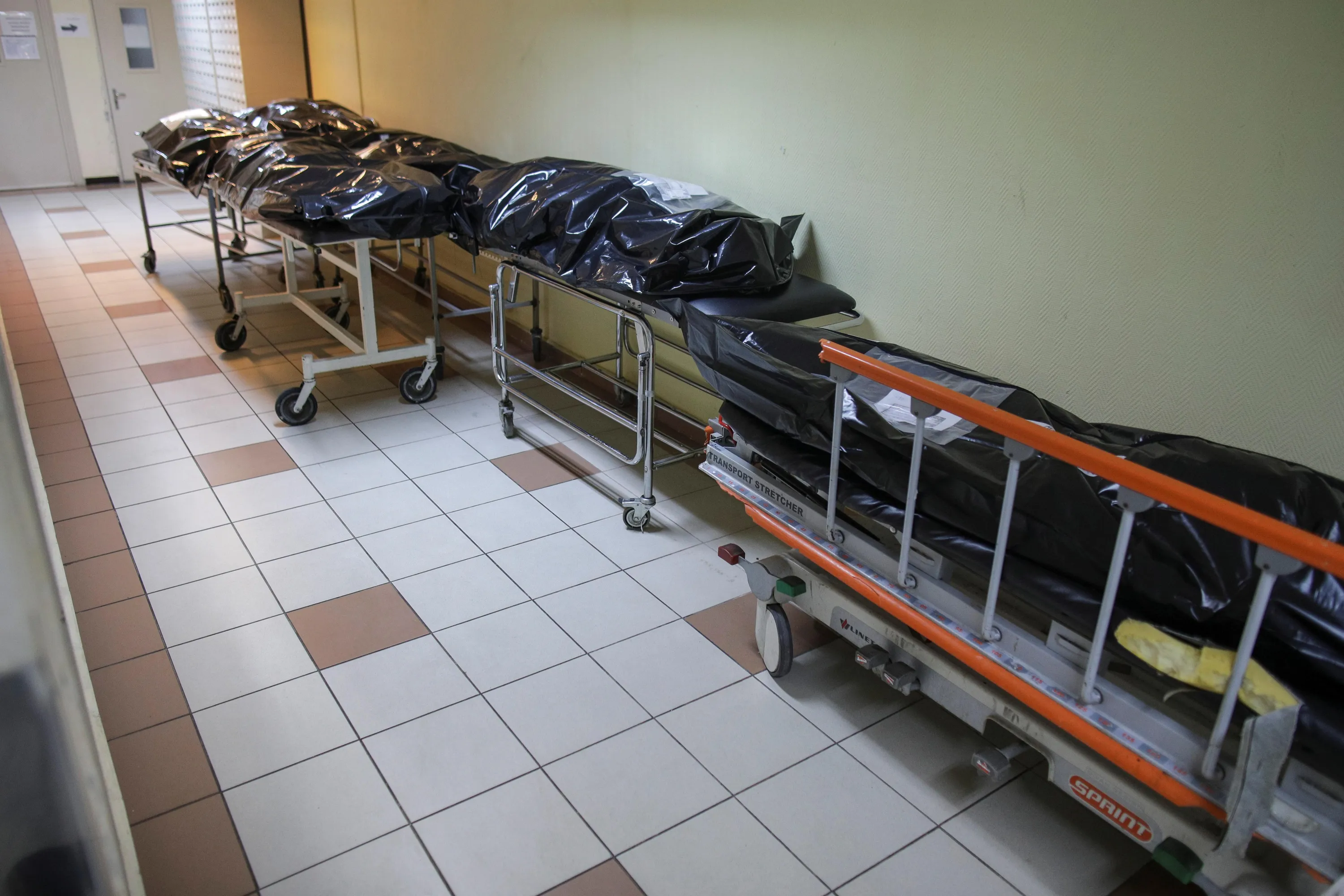 Stretchers with black body bags containing bodies of COVID-19 victims are seen deposited on a hallway leading to Bucharest's University Hospital morgue, October 29, 2021. Romania, at the forefront of a wave of COVID-19 sweeping across central and eastern Europe, has reported record numbers of daily coronavirus deaths and infections in October and says that the hospital system is stretched to breaking point. (Photo by Octav Ganea/Inquam Photos via Reuters)