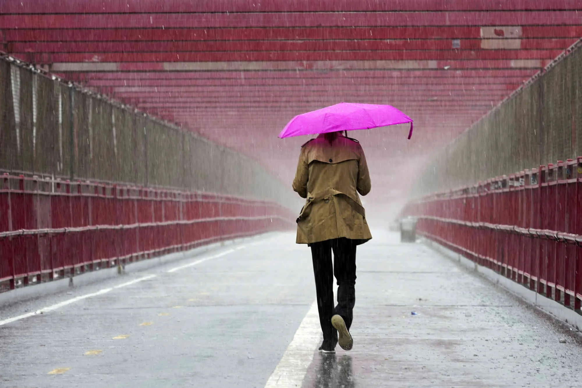 A pedestrian walks during a heavy downpour of rain over the Williamsburg bridge, Tuesday, October 26, 2021, in New York. A flash flood watch is in effect as a nor'easter moves through the New York metro area. (Photo by Mary Altaffer/AP Photo)