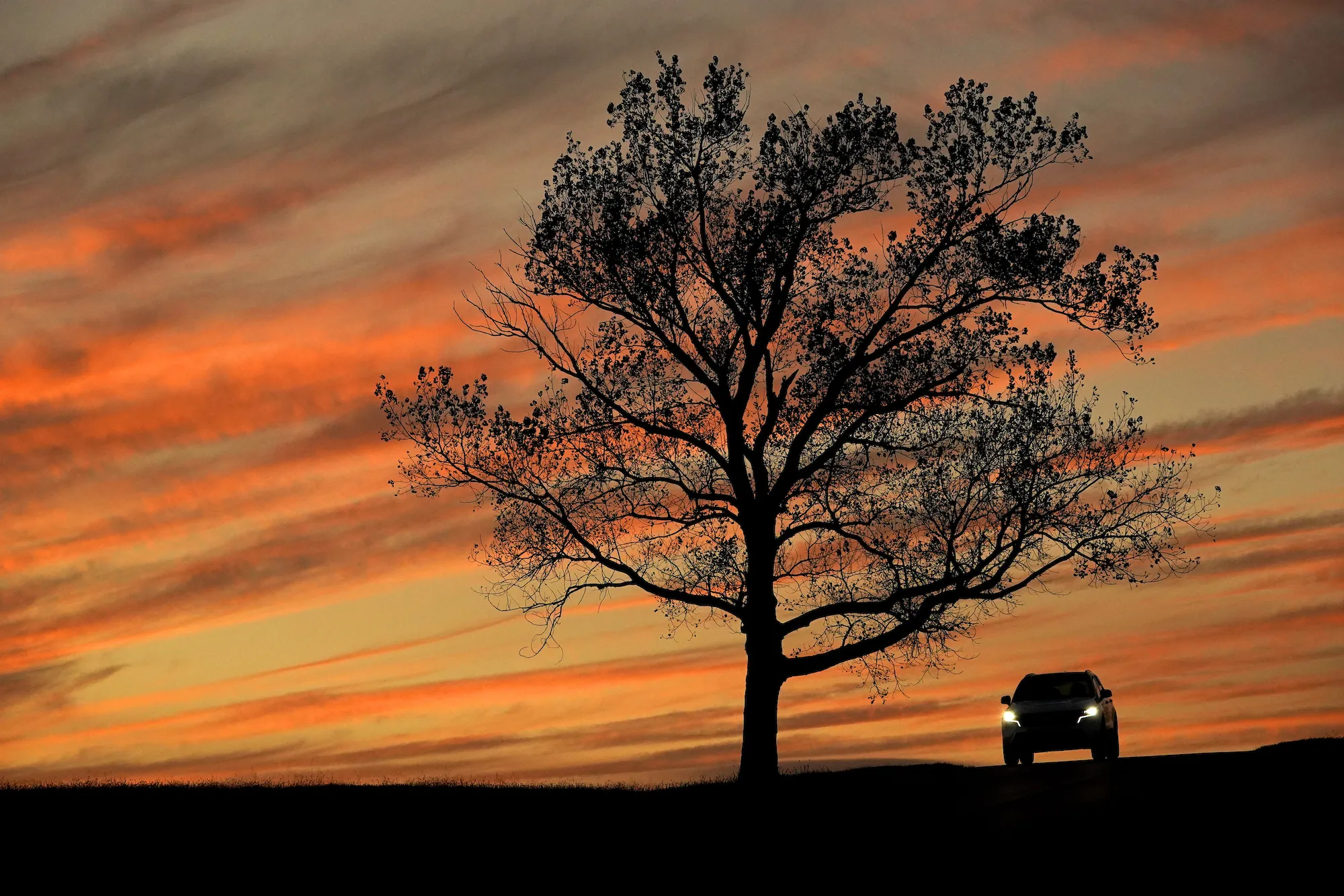 A motorist drives past a lone tree at sunset Tuesday, October 26, 2021, in Lenexa, Kan. (Photo by Charlie Riedel/AP Photo)