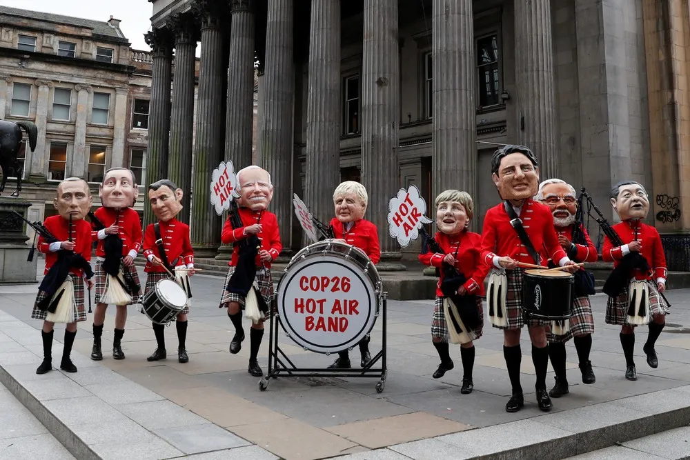 Oxfam activists with “Big Heads” of Russia's President Vladimir Putin, Italy's Prime Minister Mario Draghi, France's President Emmanuel Macron, U.S. President Joe Biden, Britain's Prime Minister Boris Johnson, Germany's Chancellor Angela Merkel, Canada's Prime Minister Justin Trudeau, India's Prime Minister Narendra Modi and China's President Xi Jinping perform in a Scottish pipe band, as the UN Climate Change Conference (COP26) takes place in Glasgow, Scotland, Britain, November 1, 2021. (Photo by Lee Smith/Reuters)