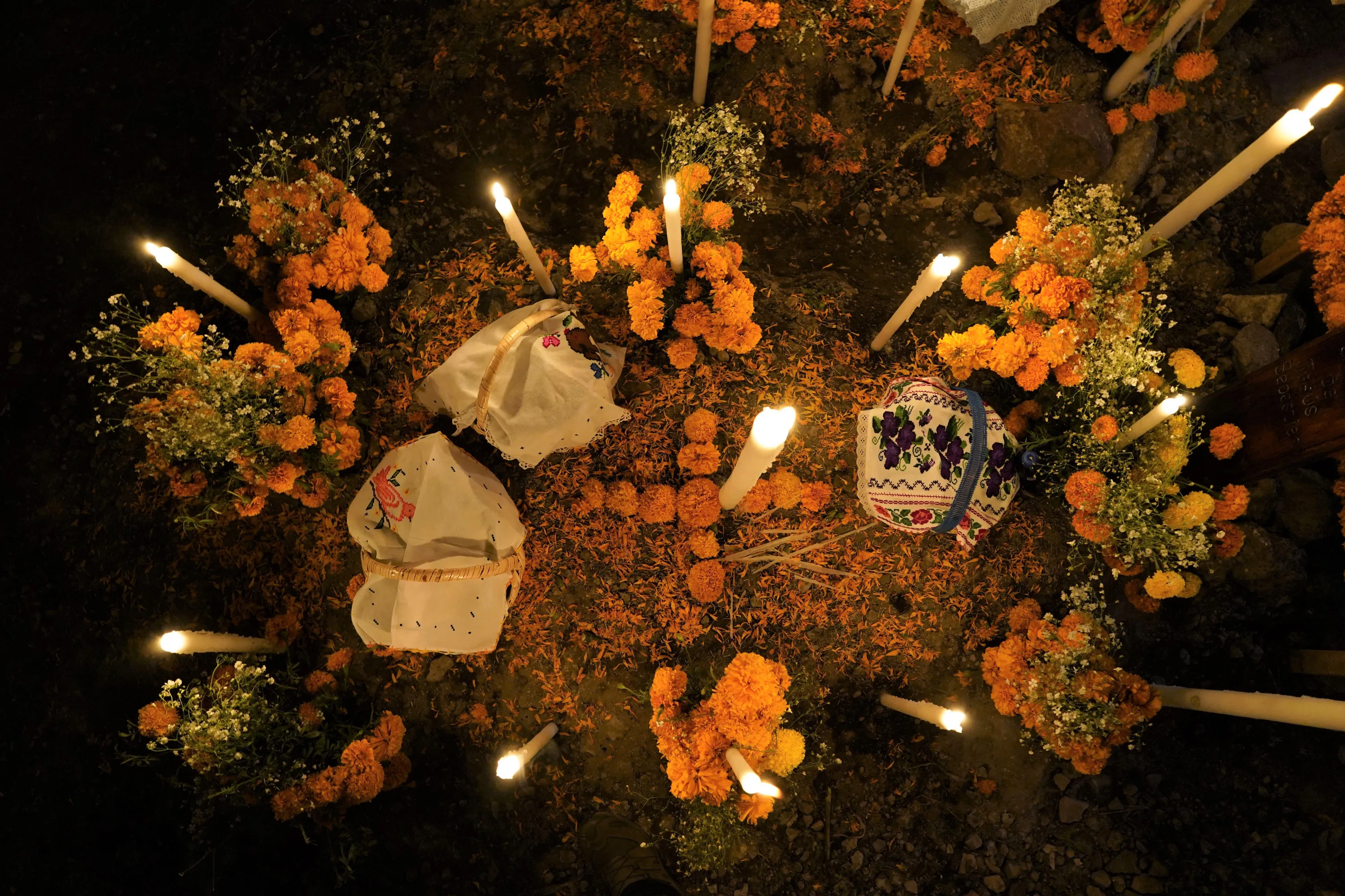 Flowers, food offerings and candles adorn a tomb as relatives spend the night next to the tomb of their loved one during Day of the Dead festivities at the the Arocutin cemetery in Michoacan state, Mexico, Monday, November 1, 2021. In a tradition that coincides with All Saints Day and All Souls Day, families decorate the graves of departed relatives with flowers and candles, and spend the night in the cemetery, eating and drinking as they keep company with their deceased loved ones. (Photo by Eduardo Verdugo/AP Photo)