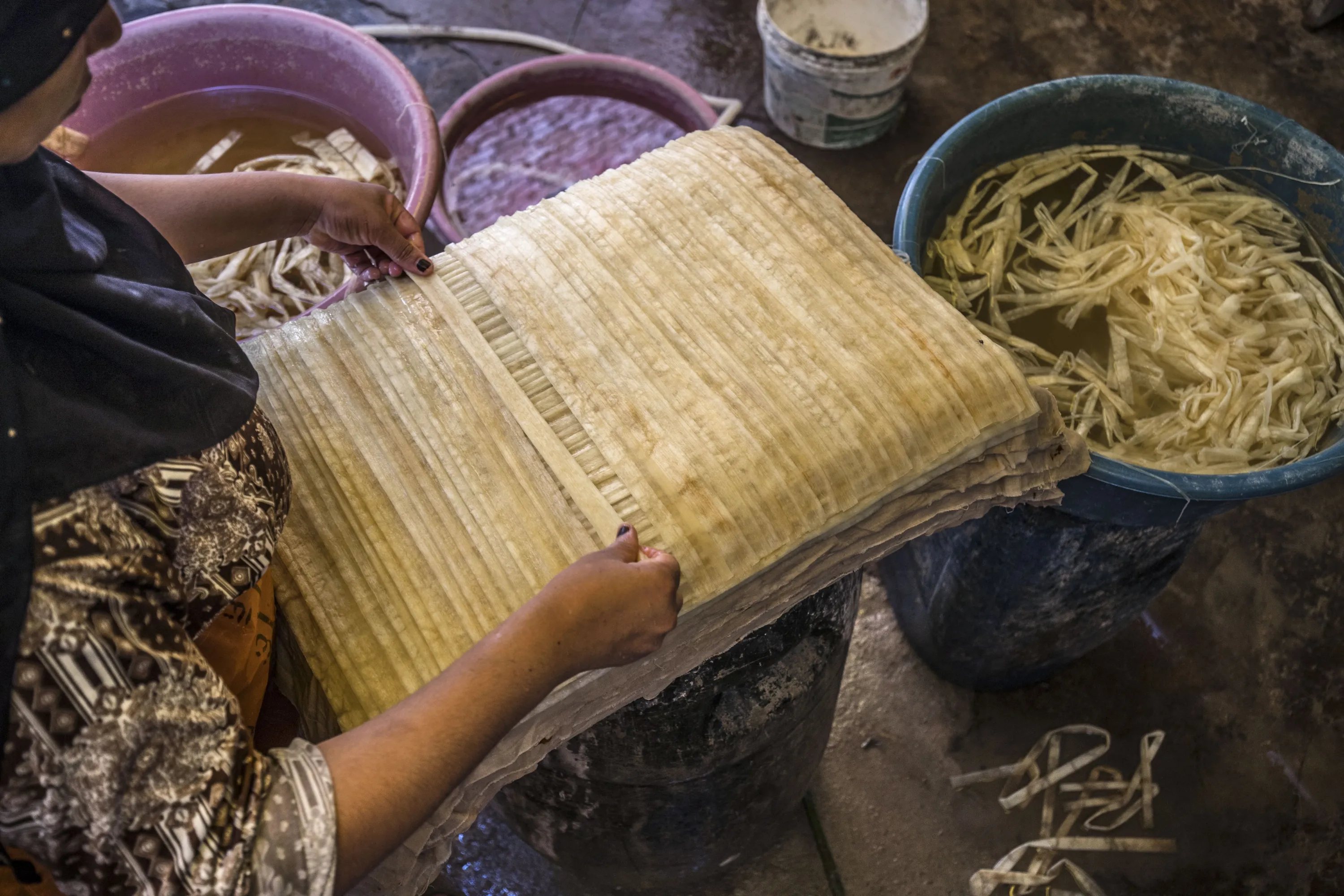 A woman lays out soaked thin strips of papyrus to form a sheet, before compression and drying at the workshop in the village of al-Qaramous in Sharqiyah province, in Egypt's northern fertile Nile Delta region, northeast of the capital, on July 28, 2021. (Photo by Khaled Desouki/AFP Photo)