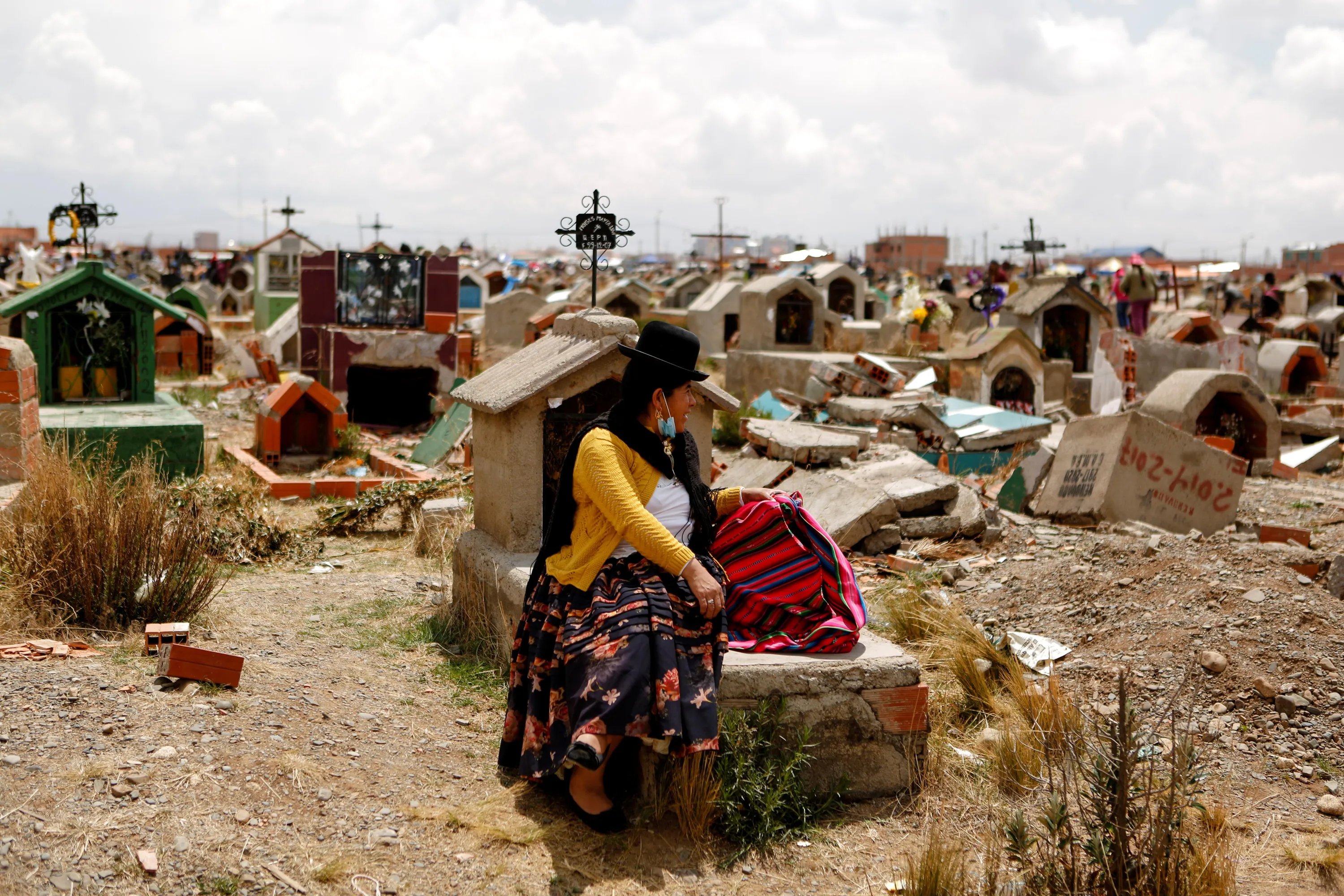 A woman sits on a grave at the Mercedario graveyard as she observes the Day of the Dead celebration, in El Alto, on the outskirts of La Paz, Bolivia, November 2, 2021. (Photo by Manuel Claure/Reuters)