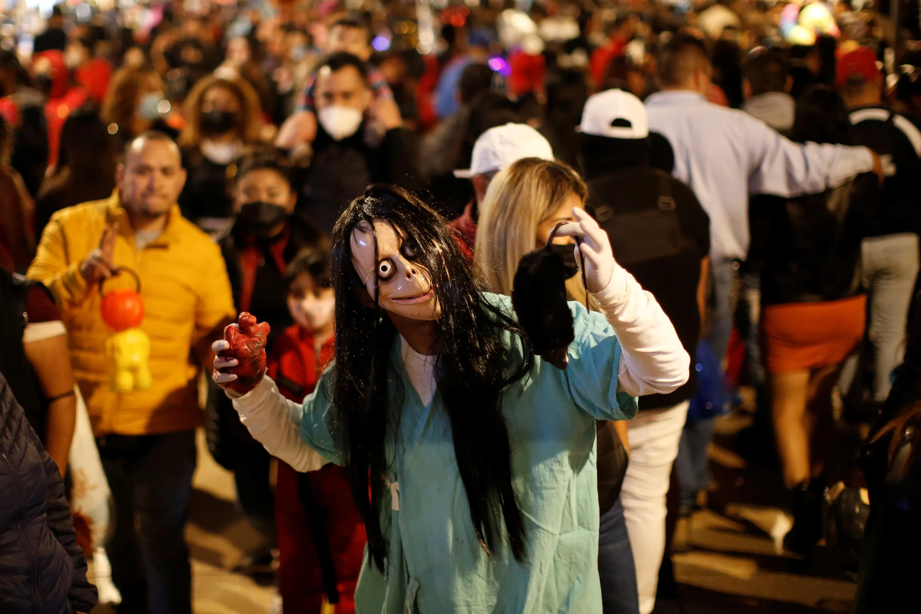 A person wearing a costume poses for a picture near Zocalo Square during the Day of the Dead celebration in Mexico City, Mexico, November 1, 2021. (Photo by Gustavo Graf/Reuters)