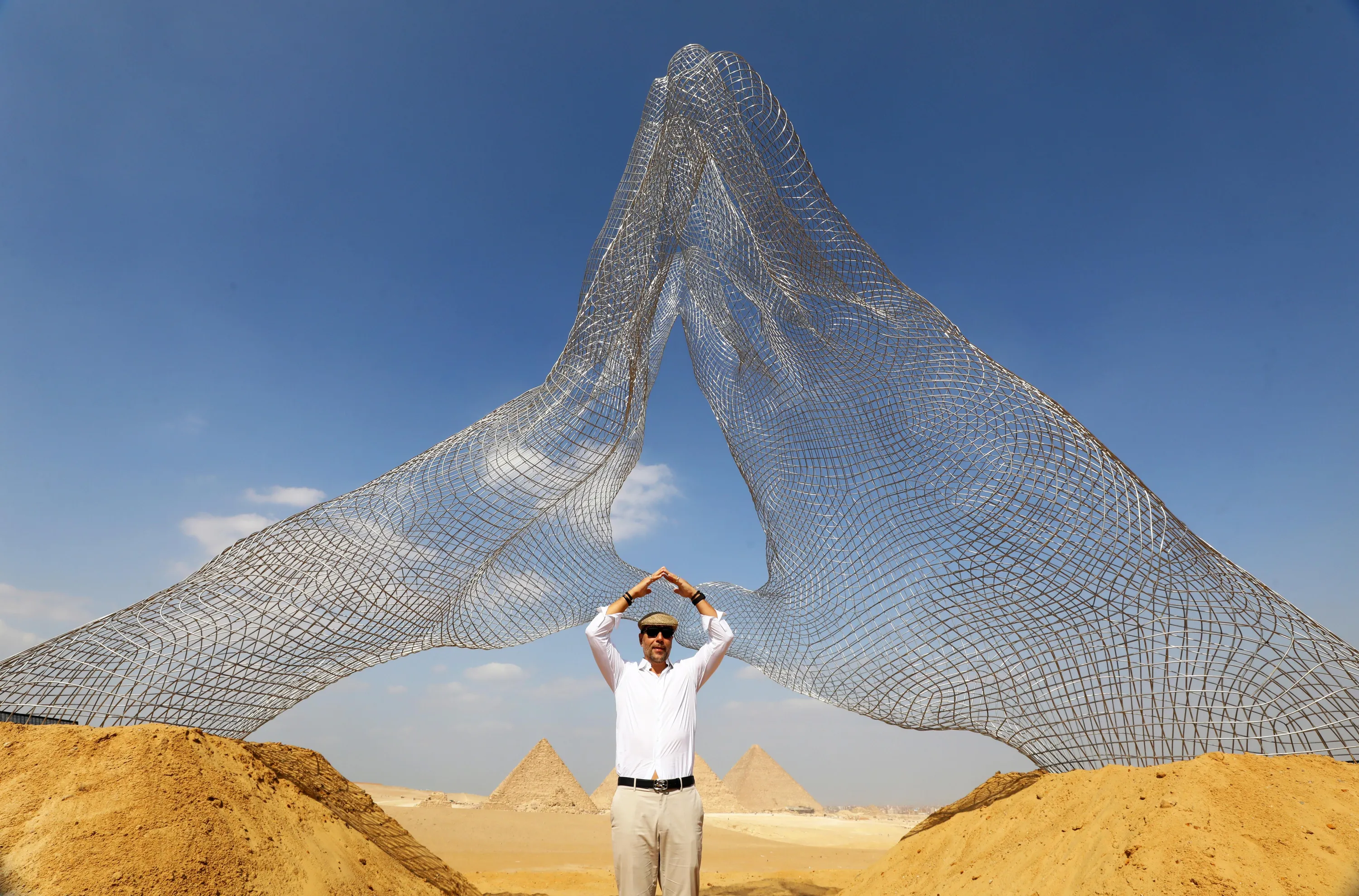 Italian sculptor Lorenzo Quinn, son of late actor Anthony Quinn, poses in front of his sculpture “Together” near the pyramids in Giza, Egypt, 21 October 2021. Art D’Egypte, organizers of the large-scale sculptures and installations invited ten international contemporary artists to take part in the exhibition “Forever is Now” at the Giza Pyramids and the surrounding Giza Plateau, running until 07 November. (Photo by Khaled Elfiqi/EPA/EFE)