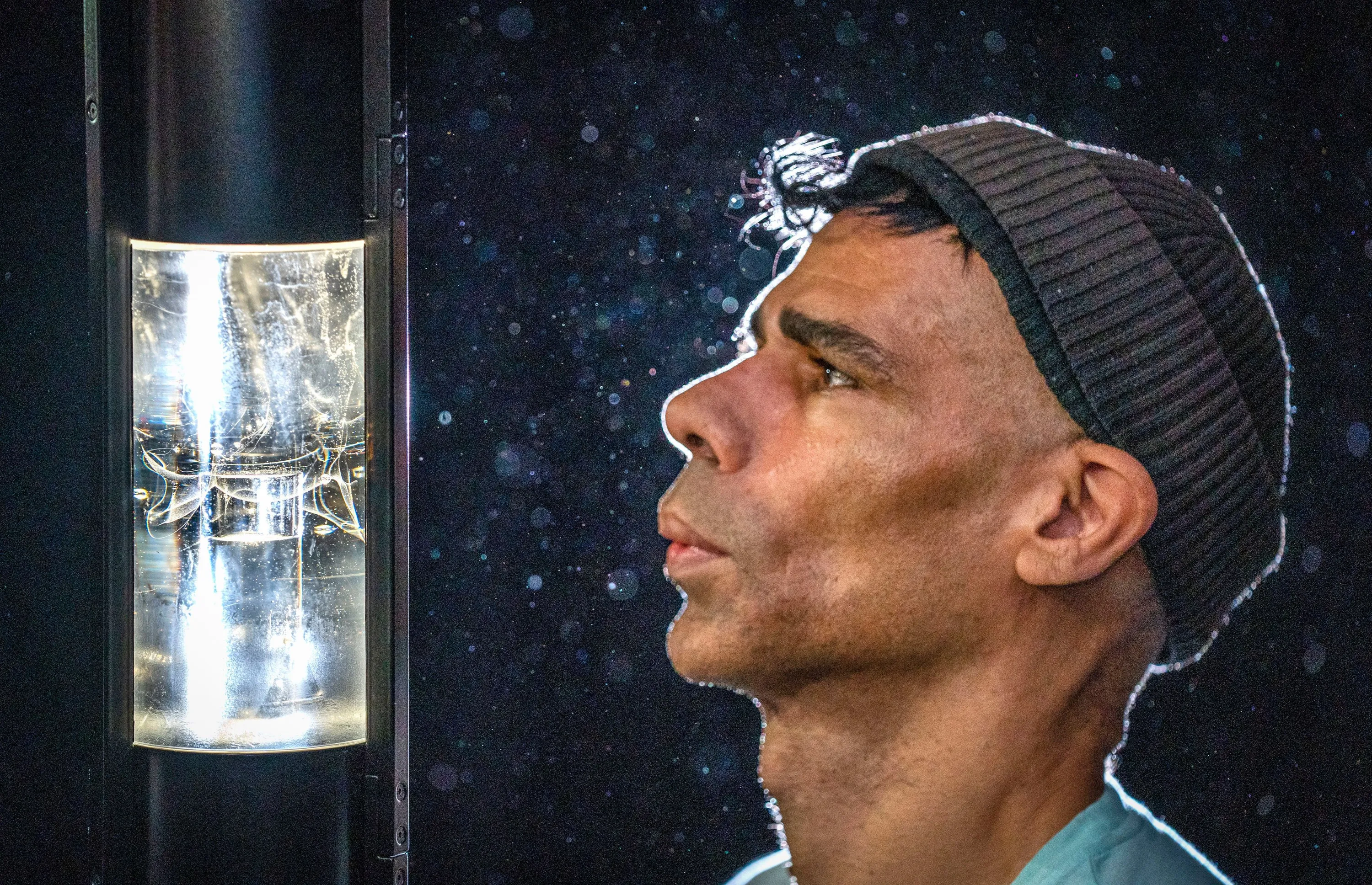 Royal College of Art artist and sculptor Wayne Binitie takes a closer look at his glass sculpture on September 29, 2020, containing air from the year 1765 which is on display at a new immersive exhibition “Polar Zero” created in collaboration with British Antarctic Survey and global engineering and design firm Arup, at the Glasgow Science Centre to coincide with the Cop26 summit which takes place in Glasgow next month. (Photo by Jane Barlow/PA Images via Getty Images)