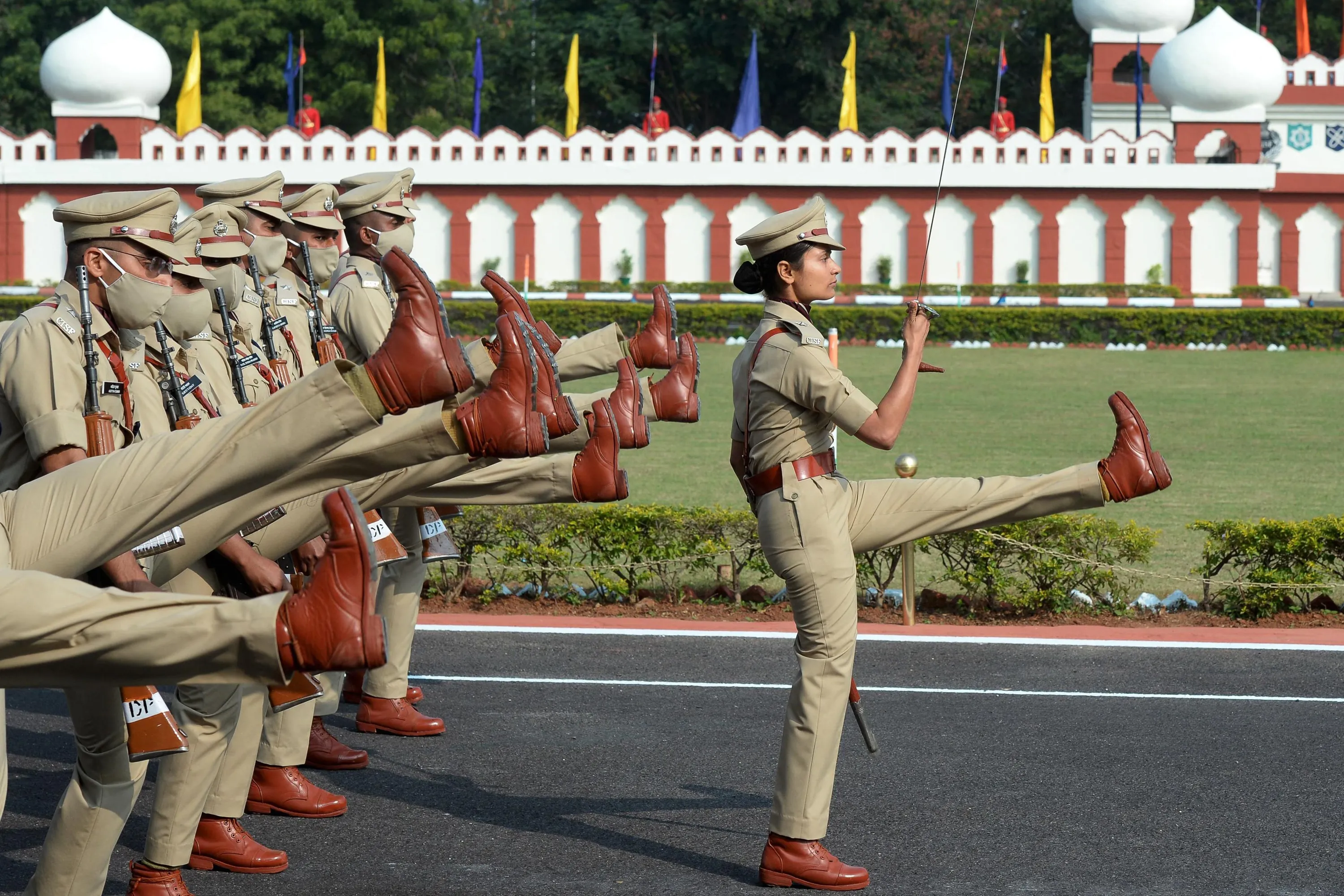 Members of the Central Industrial Security Force (CISF) march during the 34th batch assistant commandants parade at the National Industrial Security Academy (NISA) in Hyderabad on October 29, 2021. (Photo by Noah Seelam/AFP Photo)