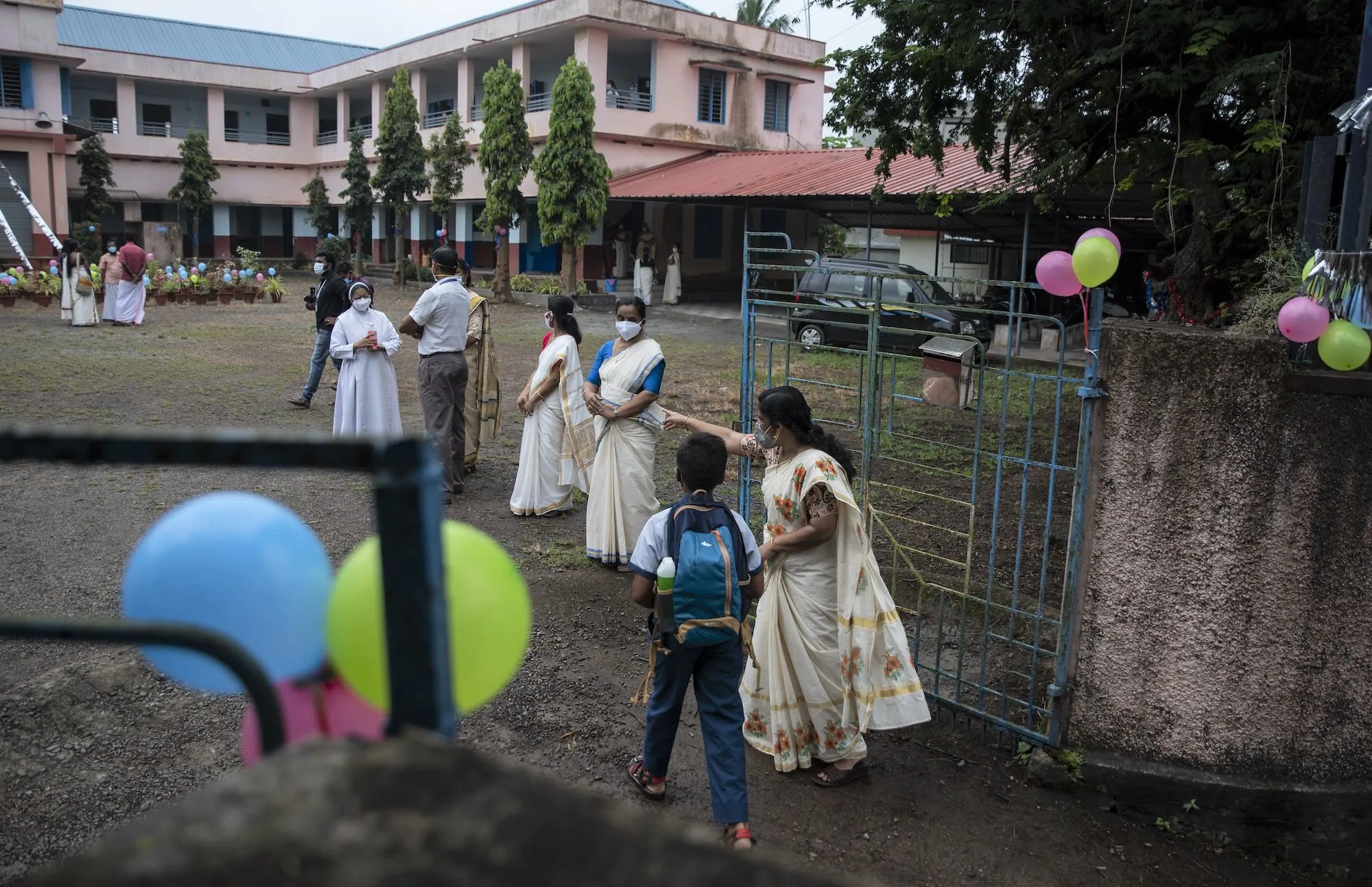 A teacher guides a student to his classroom as schools reopened in Kochi, Kerala state, India, Monday, November 1, 2021. Schools in this southern state that had remained closed for nearly twenty months due to the coronavirus pandemic reopened Monday. (Photo by R.S. Iyer/AP Photo)