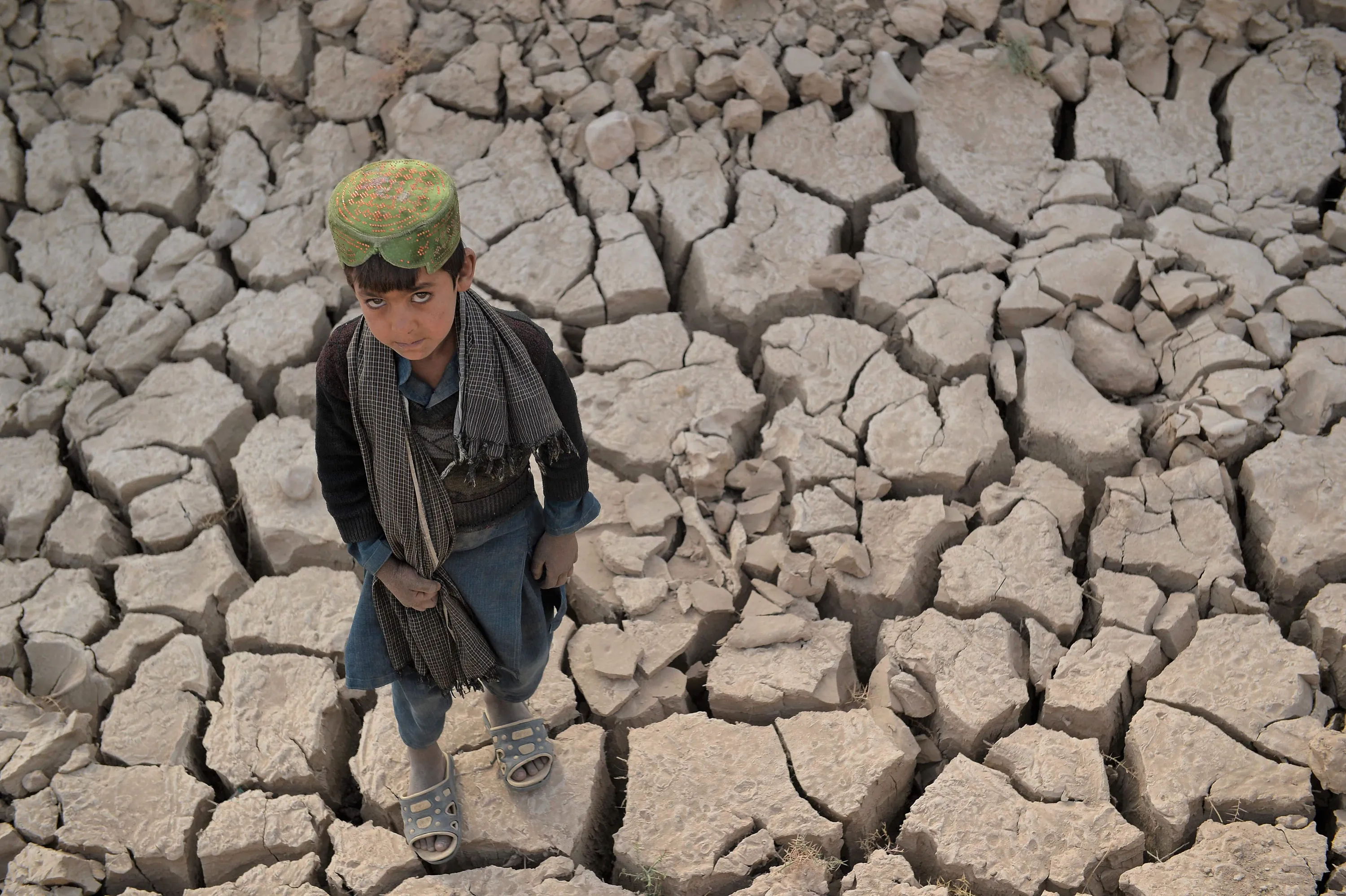 This picture taken on October 15, 2021 shows a child standing on a dry land in Bala Murghab district of Badghis province. Drought stalks the parched fields around the remote Afghan district of Bala Murghab, where climate change is proving a deadlier foe than the country's recent conflicts. (Photo by Hoshang Hashimi/AFP Photo)