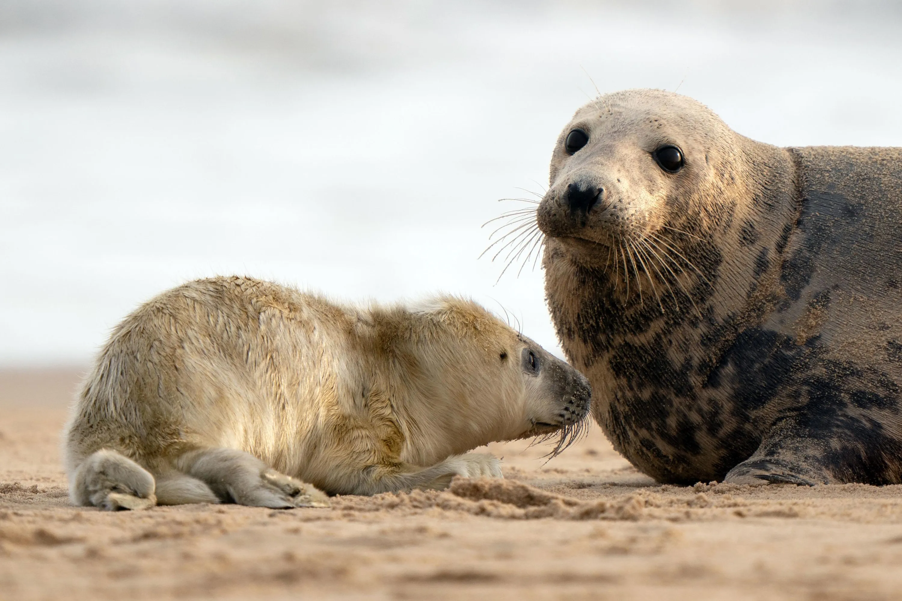 A grey seal with her newborn pup on the beach at Horsey in Norfolk on Friday October 29, 2021, as the pupping season begins at one the UK's most important sites for the mammals. (Photo by Joe Giddens/PA Images via Getty Images)