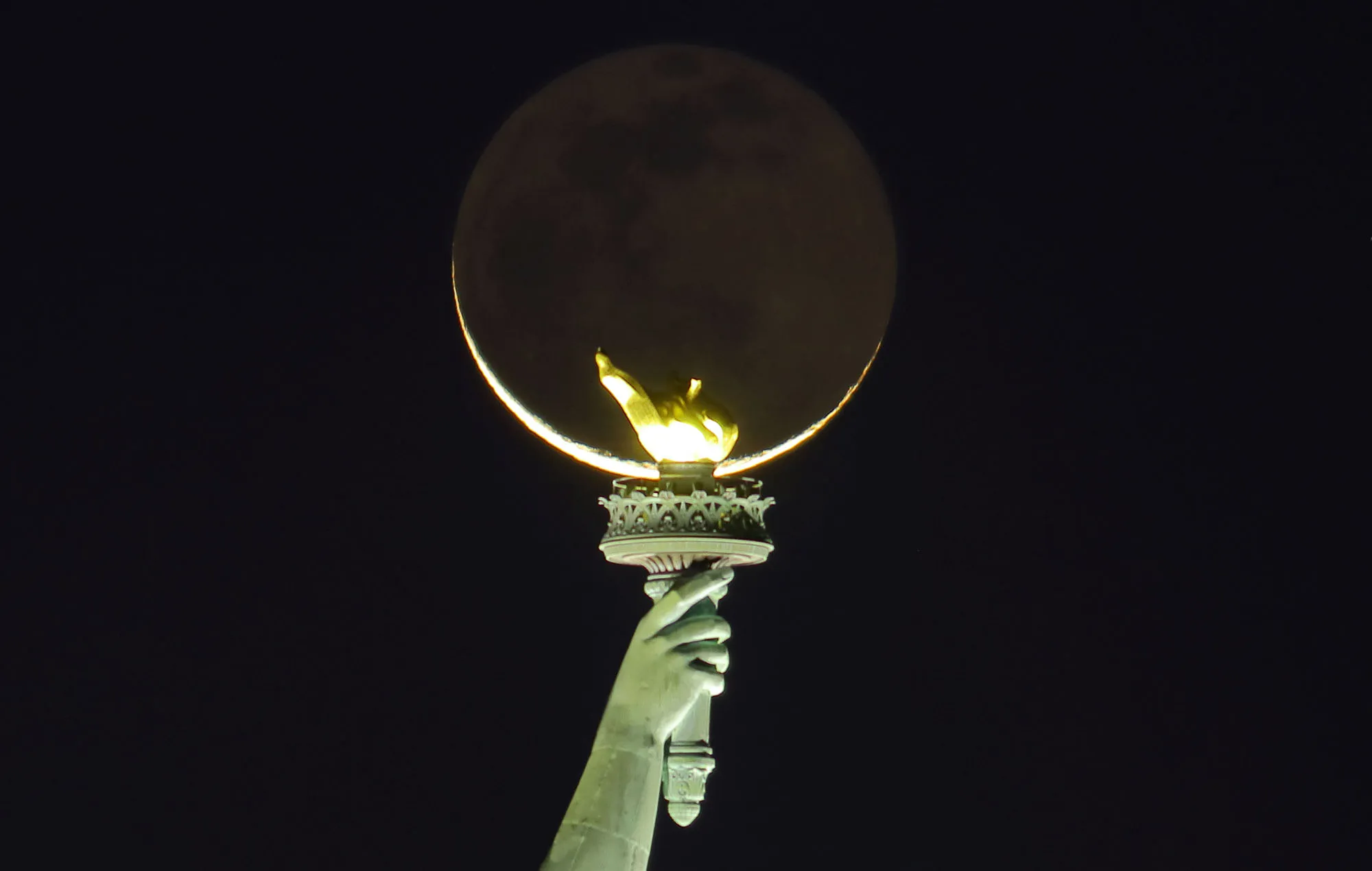 A 1.6 percent illuminated moon rises behind the torch on the Statue of Liberty before sunrise on November 3, 2021, as seen from Jersey City, New Jersey. (Photo by Gary Hershorn/Getty Images)