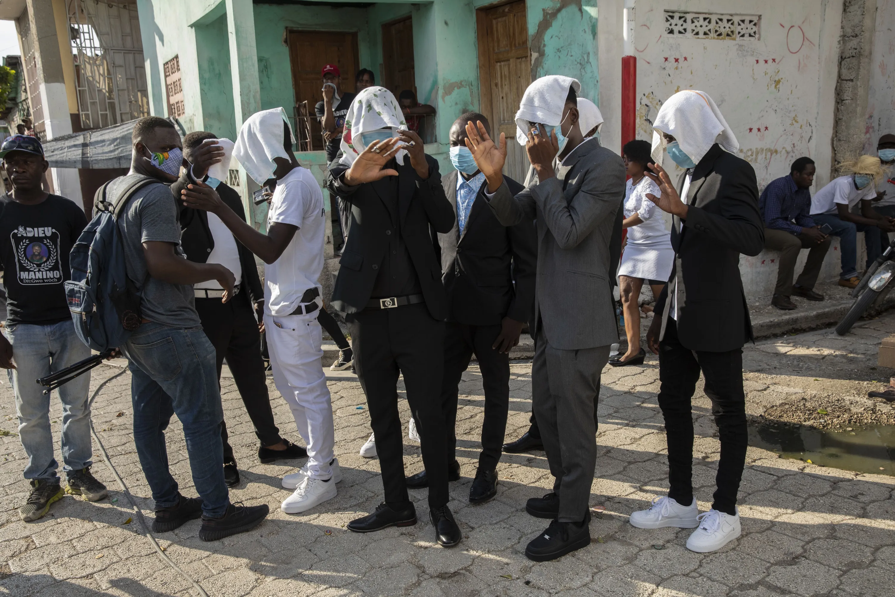 Gang members use hand towels to conceal their identity as they arrive to attend the funeral of fellow gang member Tonino Manino, in Port-au-Prince, Thursday, September 30, 2021. (Photo by Rodrigo Abd/AP Photo)
