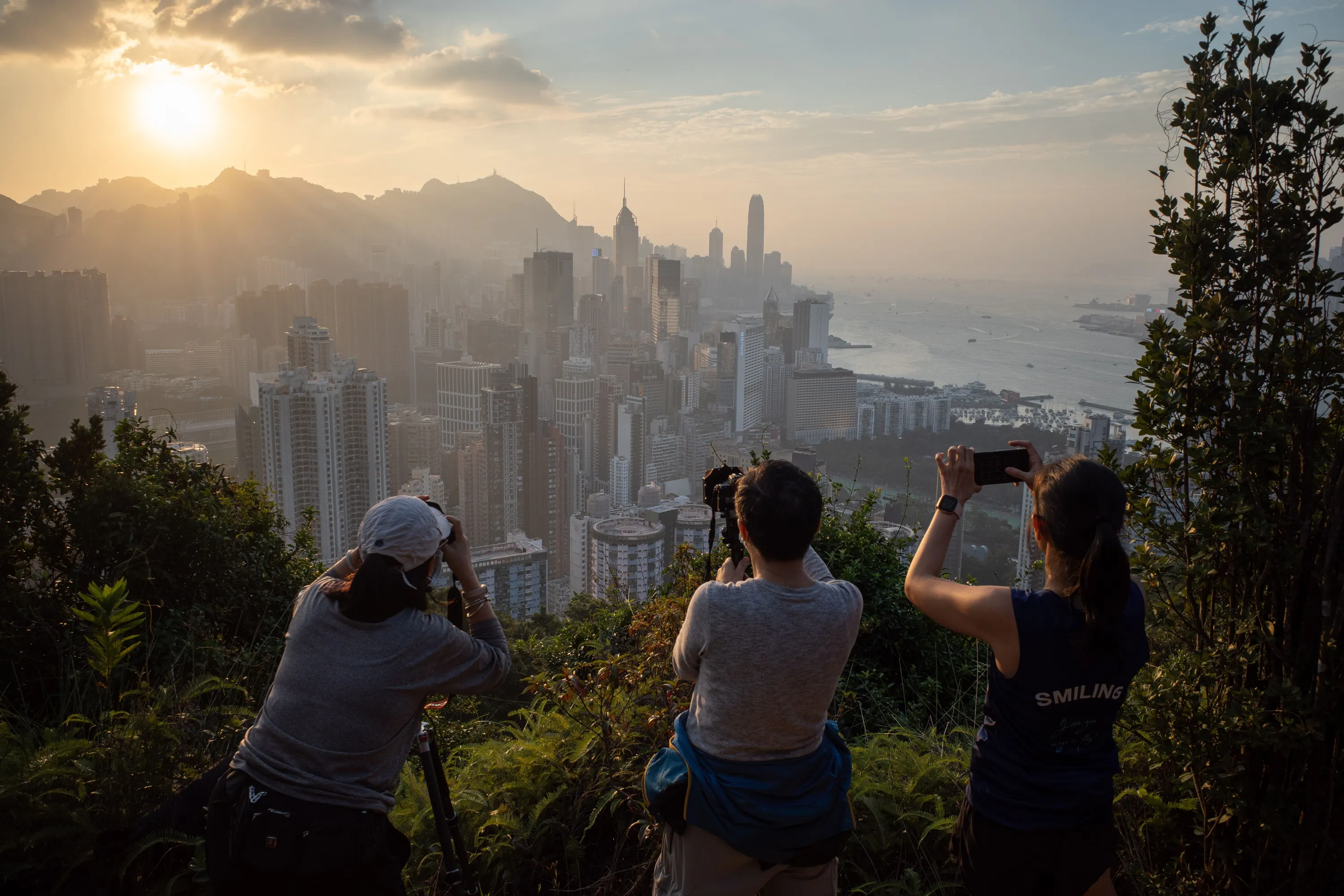 Photography enthusiasts take pictures of the setting sun over Hong Kong island in Hong Kong, China, 31 October 2021. October is month conducive to outdoor activities as the temperature averages between 19 to 28 degree Celsius and the humidity is low. (Photo by Jerome Favre/EPA/EFE)