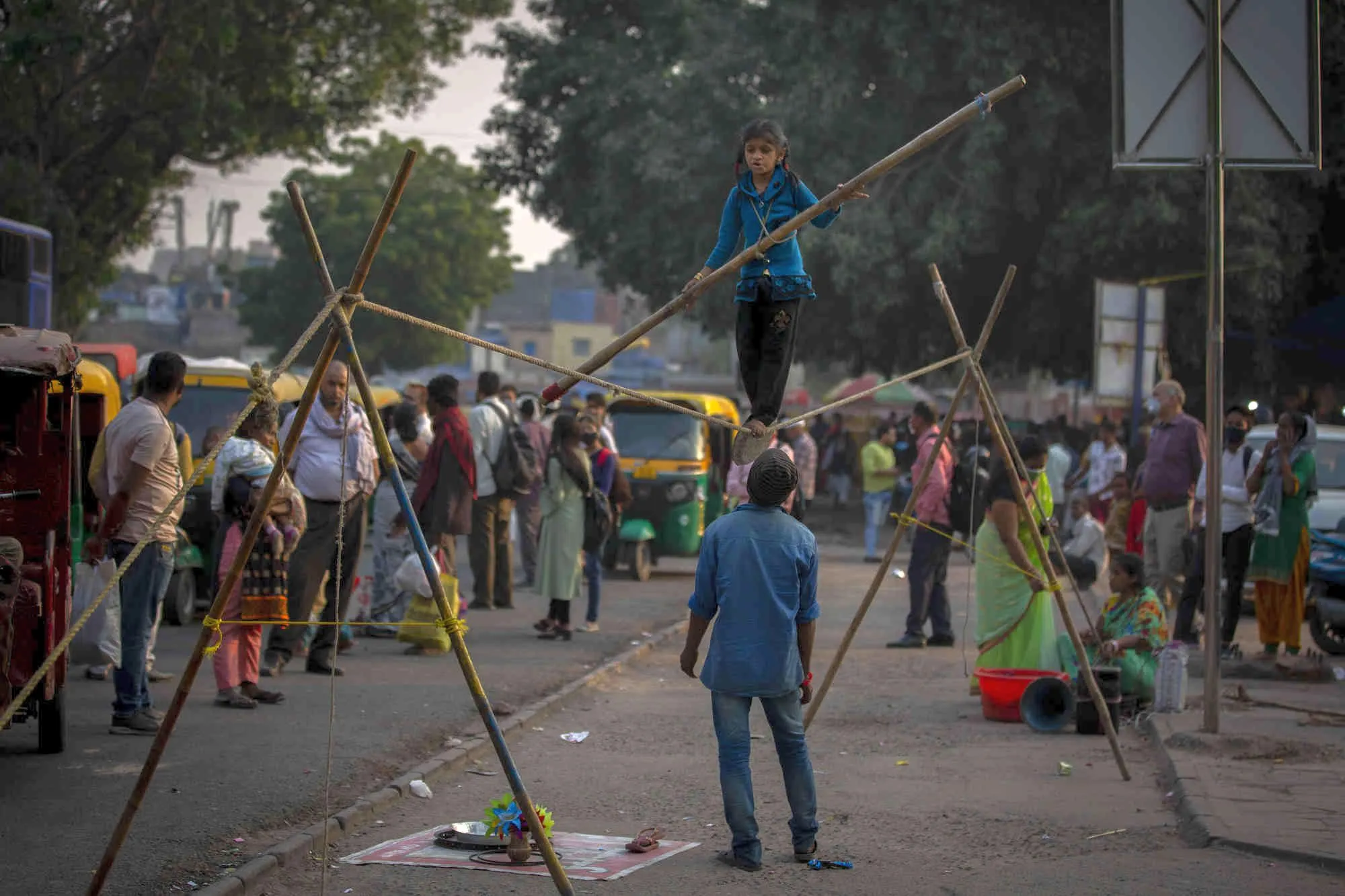 An Indian child street performer walks a tightrope in New Delhi, India, Tuesday, November 2, 2021. (Photo by Altaf Qadri/AP Photo)