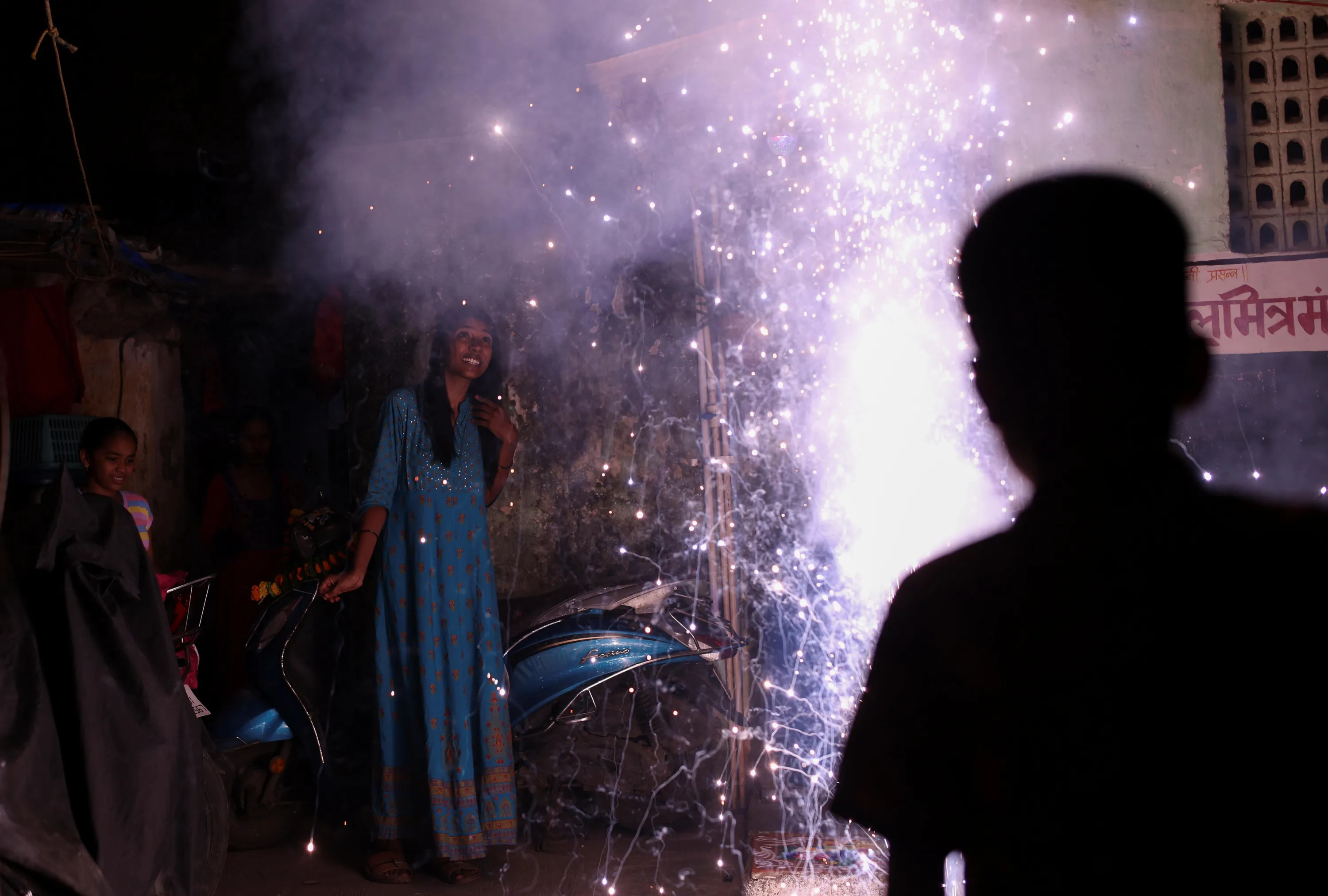 People watch as firecrackers burn during Diwali, the Hindu festival of lights, in Mumbai, India, November 4, 2021. (Photo by Francis Mascarenhas/Reuters)