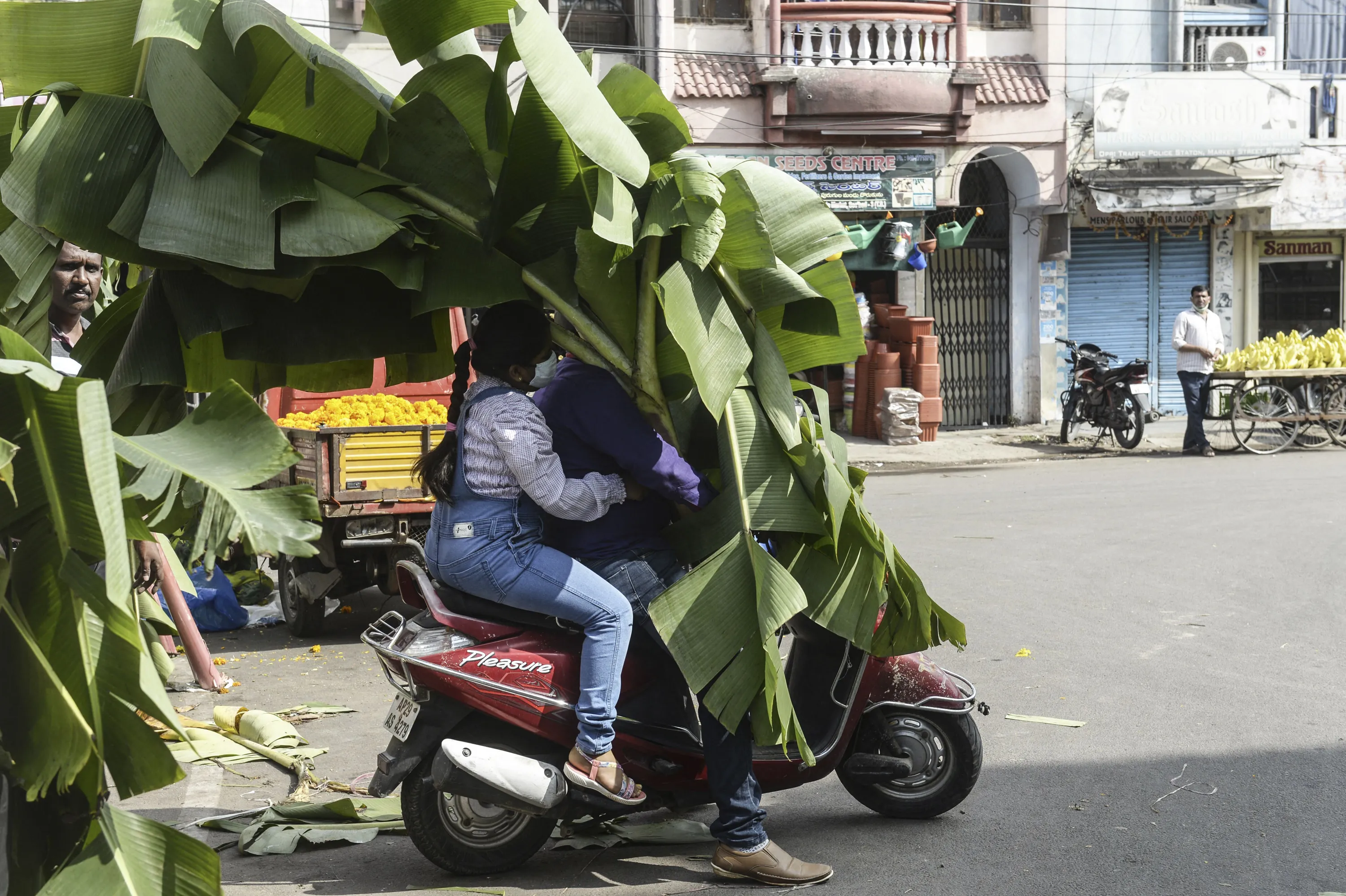 Hindu devotees carry on their scooter banana leaves to decorate their homes during Diwali celebrations at a market in Hyderabad, on November 4, 2021. (Photo by Noah Seelam/AFP Photo)