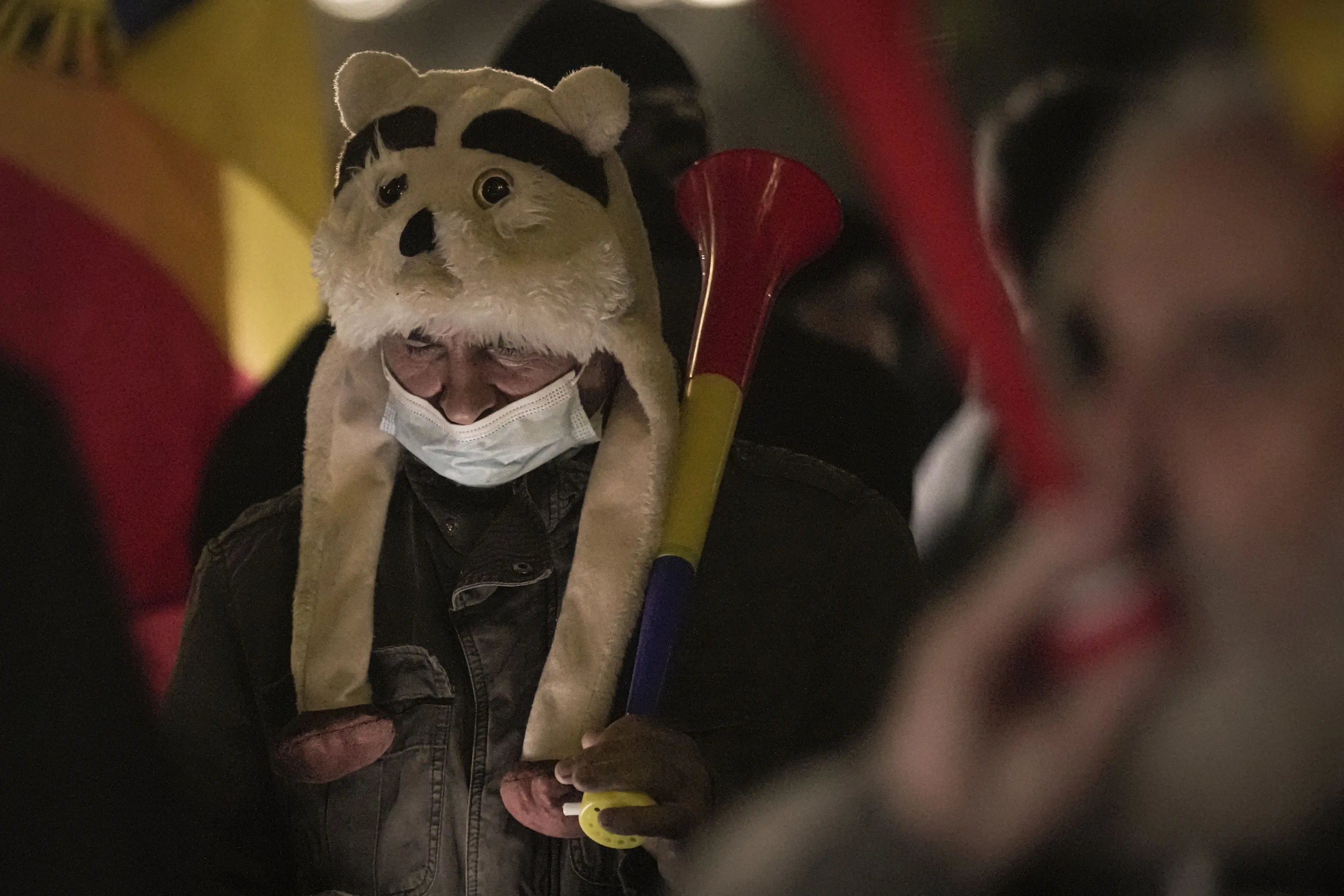 People blow horns a protest against vaccinations, the introduction of the green pass and COVID-19 related restrictions in Bucharest, Romania, Sunday, November 7, 2021. Protesters blocked traffic on the main boulevard in the Romanian capital as security forces stood by without intervening. (Photo by Vadim Ghirda/AP Photo)