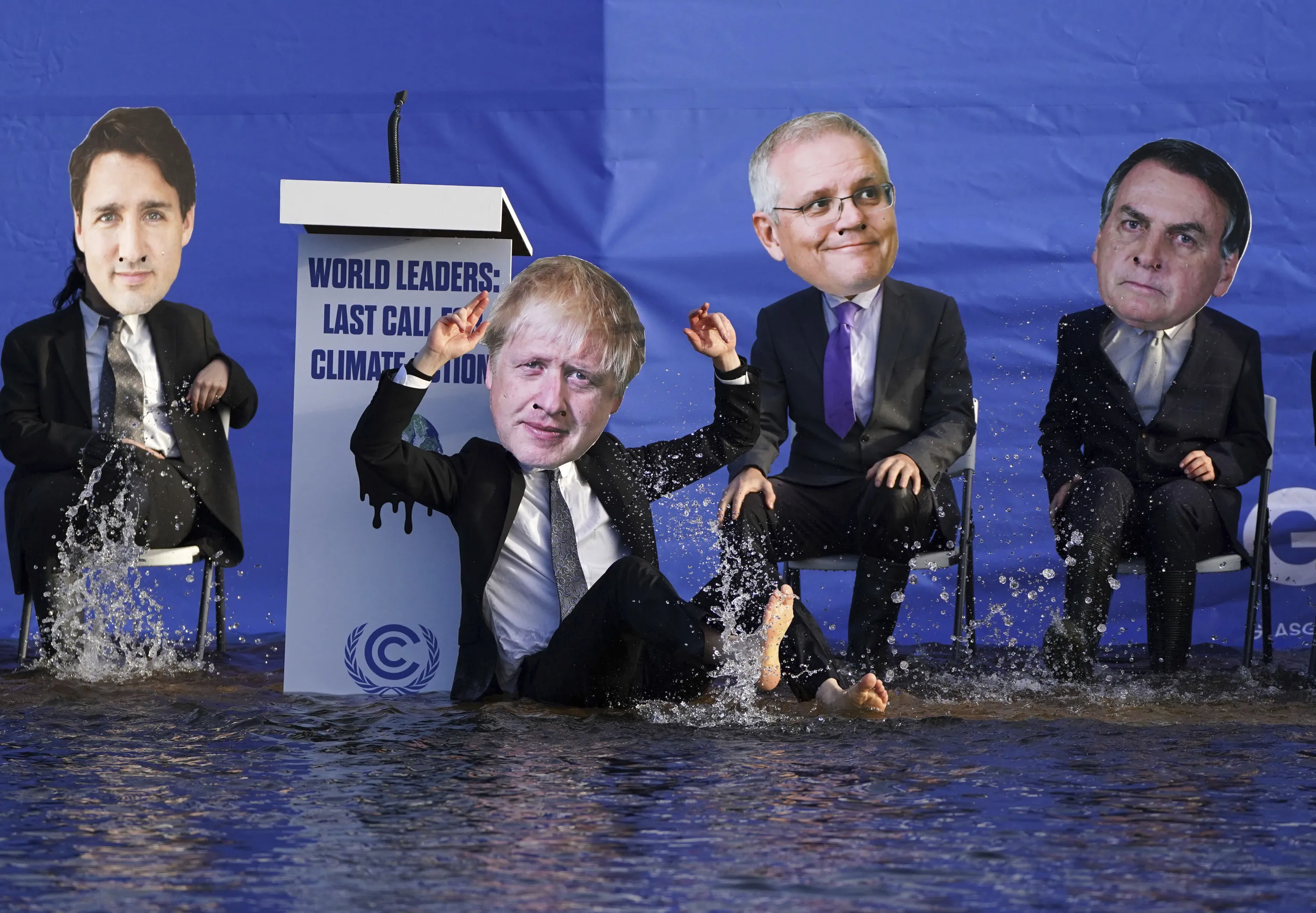 A replica of the COP26 summit's main UN negotiation stage, carrying activists dressed as world leaders, is half-sunk in the Clyde Canal during the COP26 summit in Glasgow, Scotland Tuesday November 9, 2021. (Photo by Andrew Milligan/PA Wire via AP Photo)