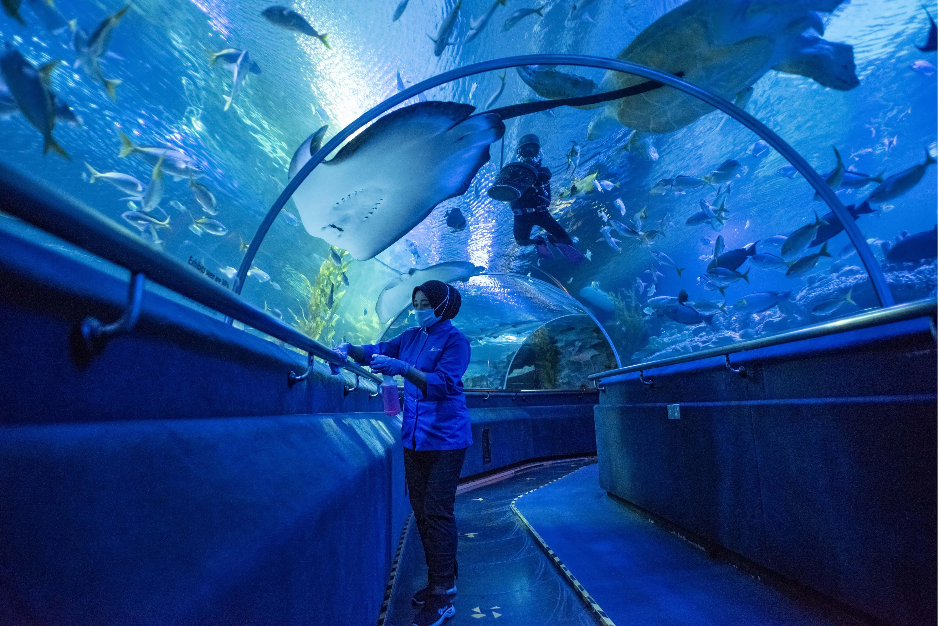 A staff member prepares for the reopening at Aquaria KLCC in Kuala Lumpur, Malaysia, September 29, 2021. Aquaria KLCC will be open for fully vaccinated visitors starting from Oct. 1. (Photo by Xinhua News Agency/Rex Features/Shutterstock)