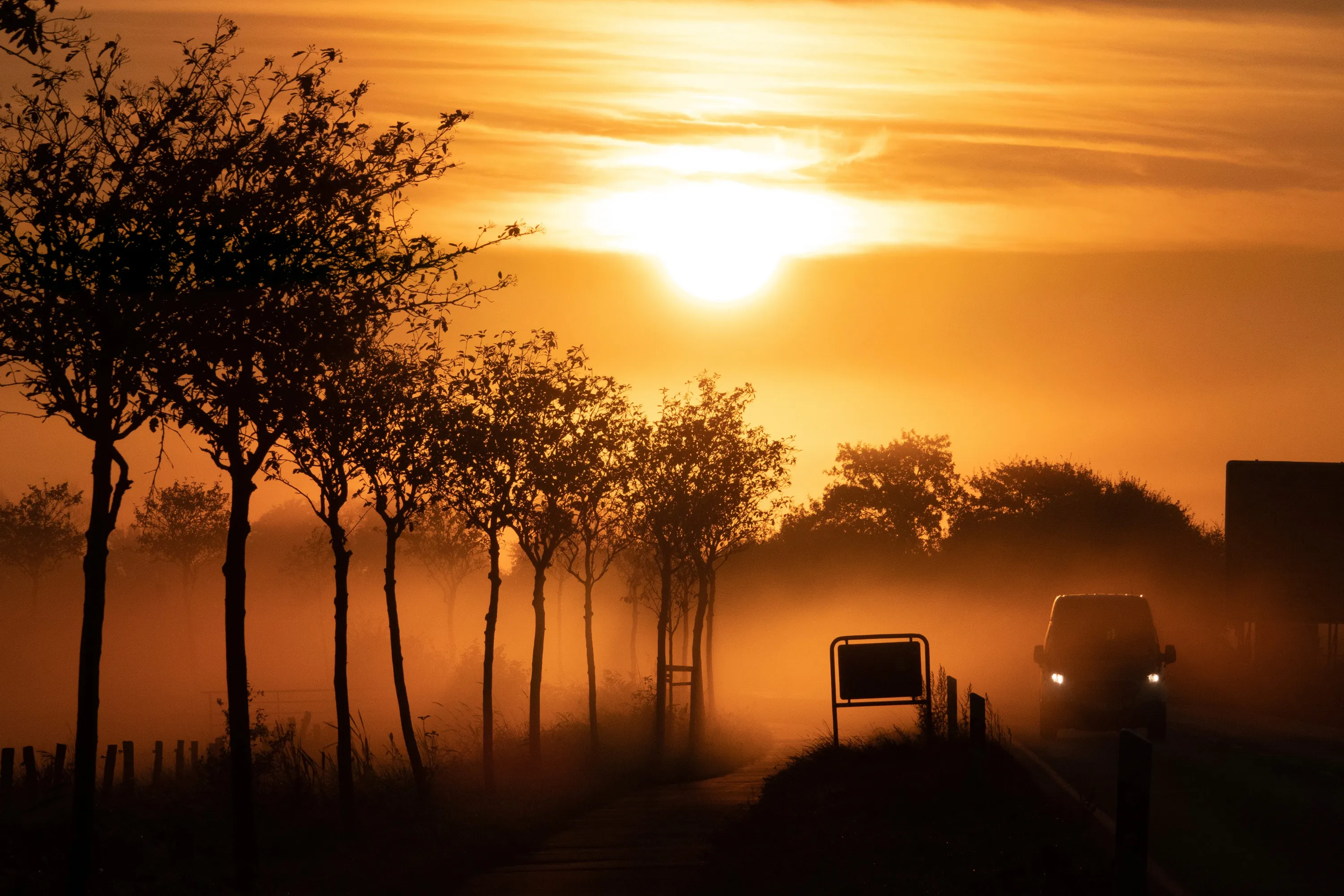 A car is driving on a country road in the fog as the sun rises in Schleswig-Holstein, Tating on October 7, 2021. (Photo by Bodo Marks/dpa)