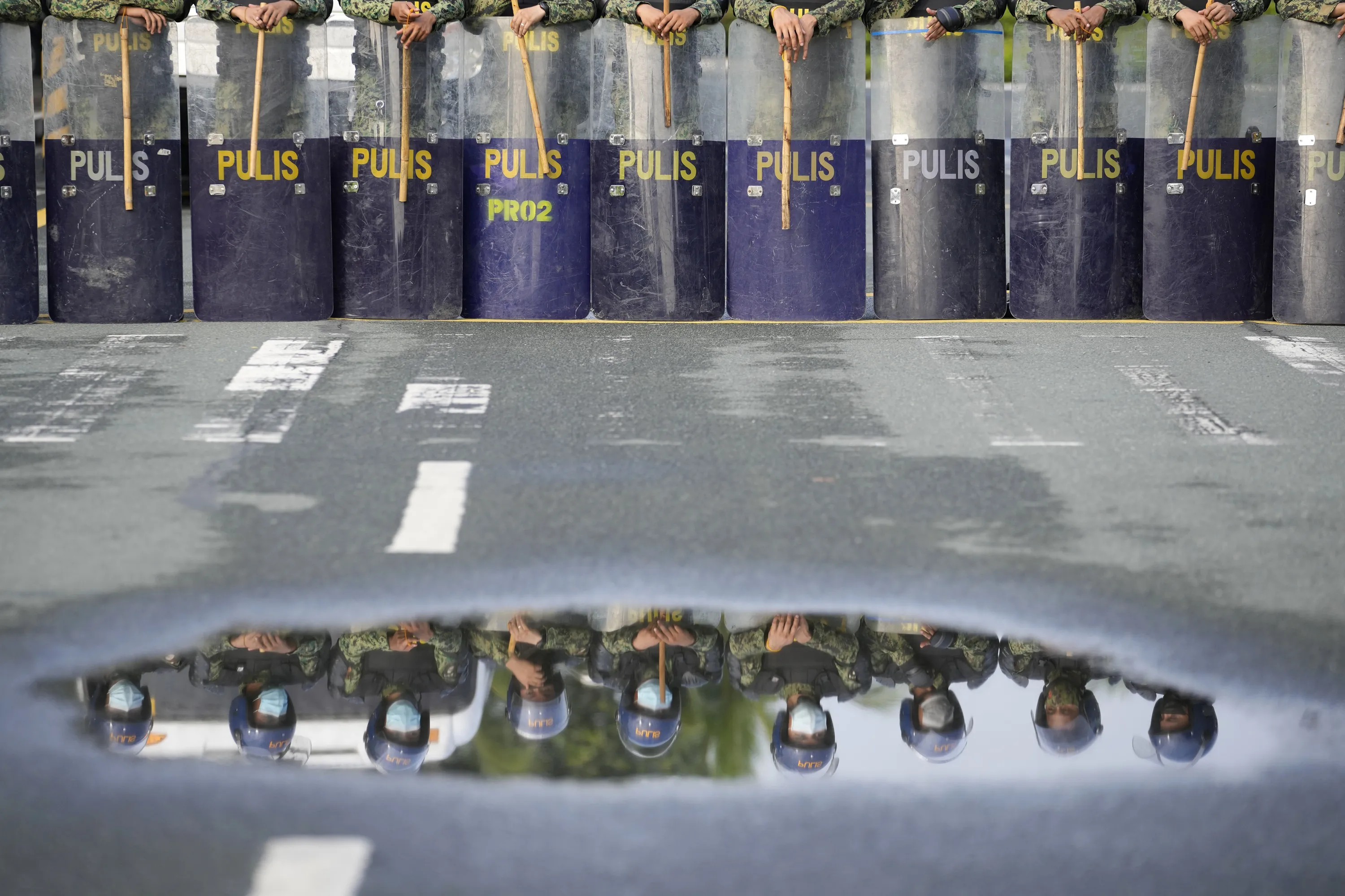 Police are reflected on water as they secure the area where politicians will file their certificate of candidacy before the Commission on Elections on Friday, October 1, 2021 in Manila, Philippines. (Photo by Aaron Favila/AP Photo)