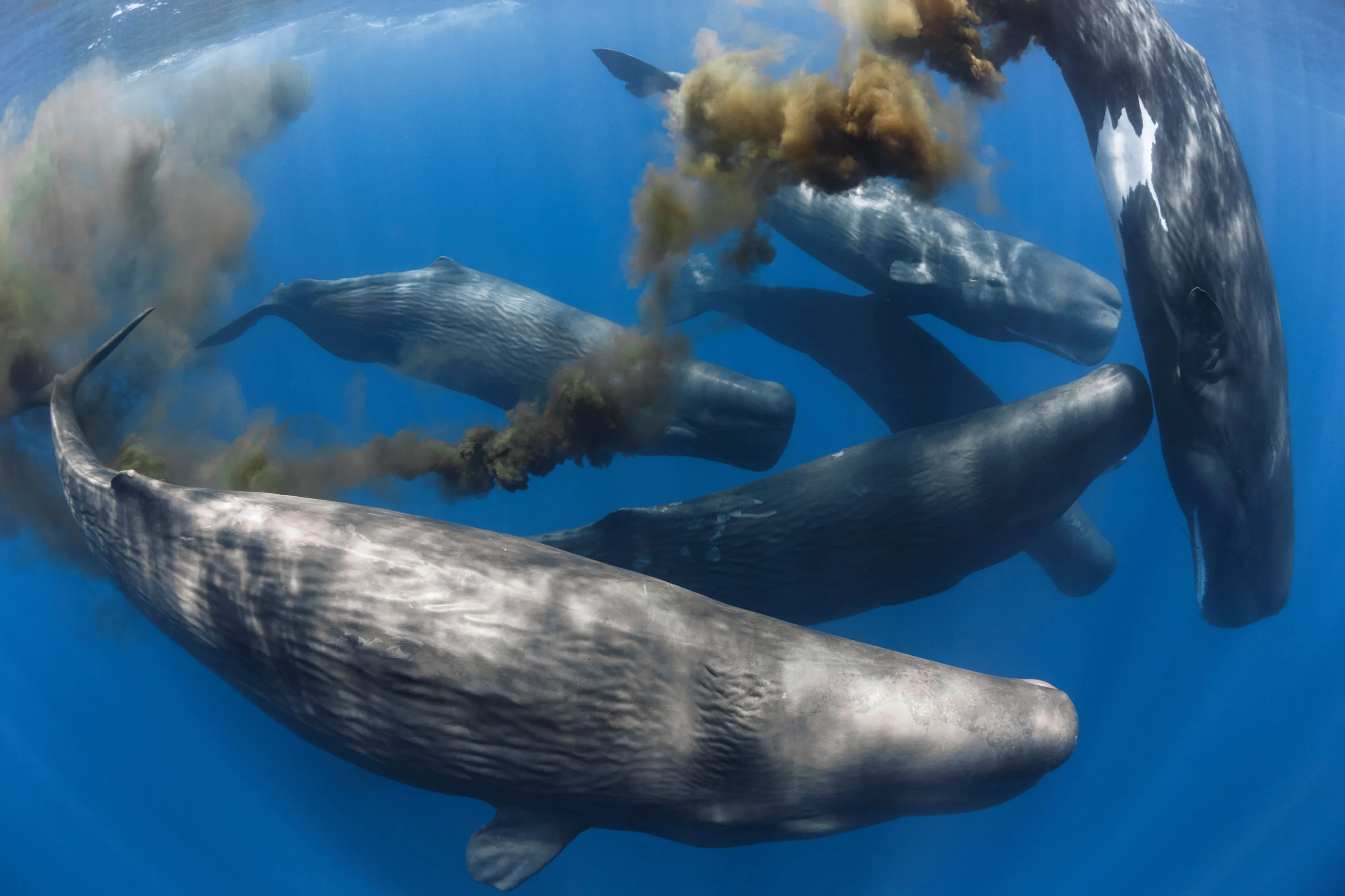 A group of female sperm whales with one defecating (Sri Lanka, Indian Ocean). The whale pictured defecating here is about 12m in length. She is an adult female sperm whale (Physeter macrocephalus) swimming along with several other members of her social unit. Consider the whale’s size, and you can imagine how substantial that plume is. Whale poo is loaded with nutrients that are otherwise scarce at the ocean surface. As the whale dives and eats, surfaces and poops, she cycles nutrients from the depths of the oceans to the surface of the sea, fertilising the ocean. (Photo by Tony Wu/naturepl.com/LDY Agency)