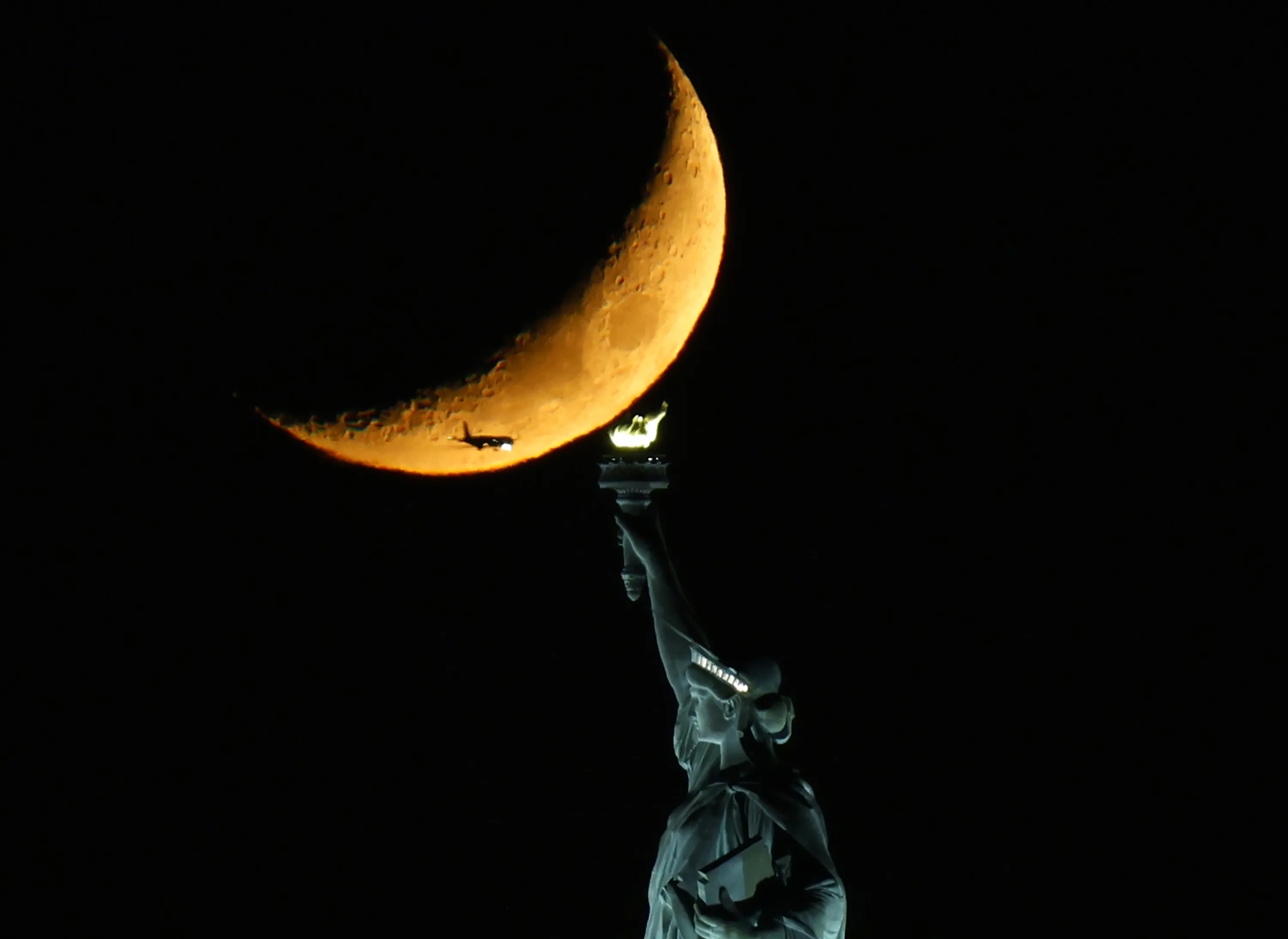 A Waxing Crescent Moon sets behind The Statue of Liberty on Monday, November 08, 2021 in New York City. (Photo by John Angelillo/UPI/Rex Features/Shutterstock)