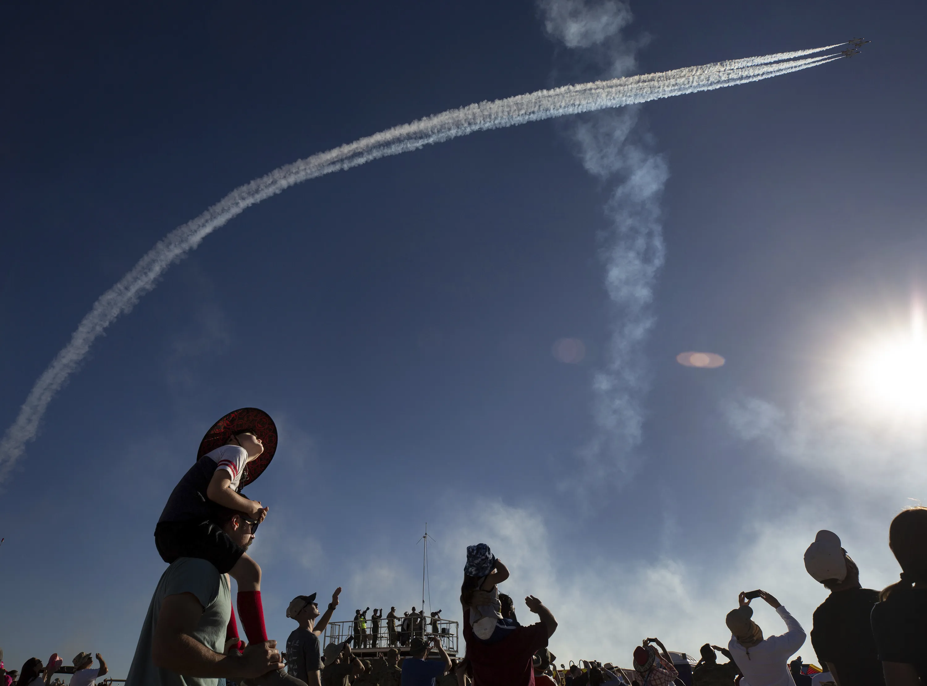 A boy squints while looking into the sun at the U.S. Air Force Thunderbirds at the Thunder & Lightning Over Arizona air show at Davis-Monthan Air Force Base, in Tucson, Ariz., Saturday, November 6, 2021. The show features dozens of aircraft flying and on display, from World War II to present day. (Photo by Rick Wiley/Arizona Daily Star via AP Photo)