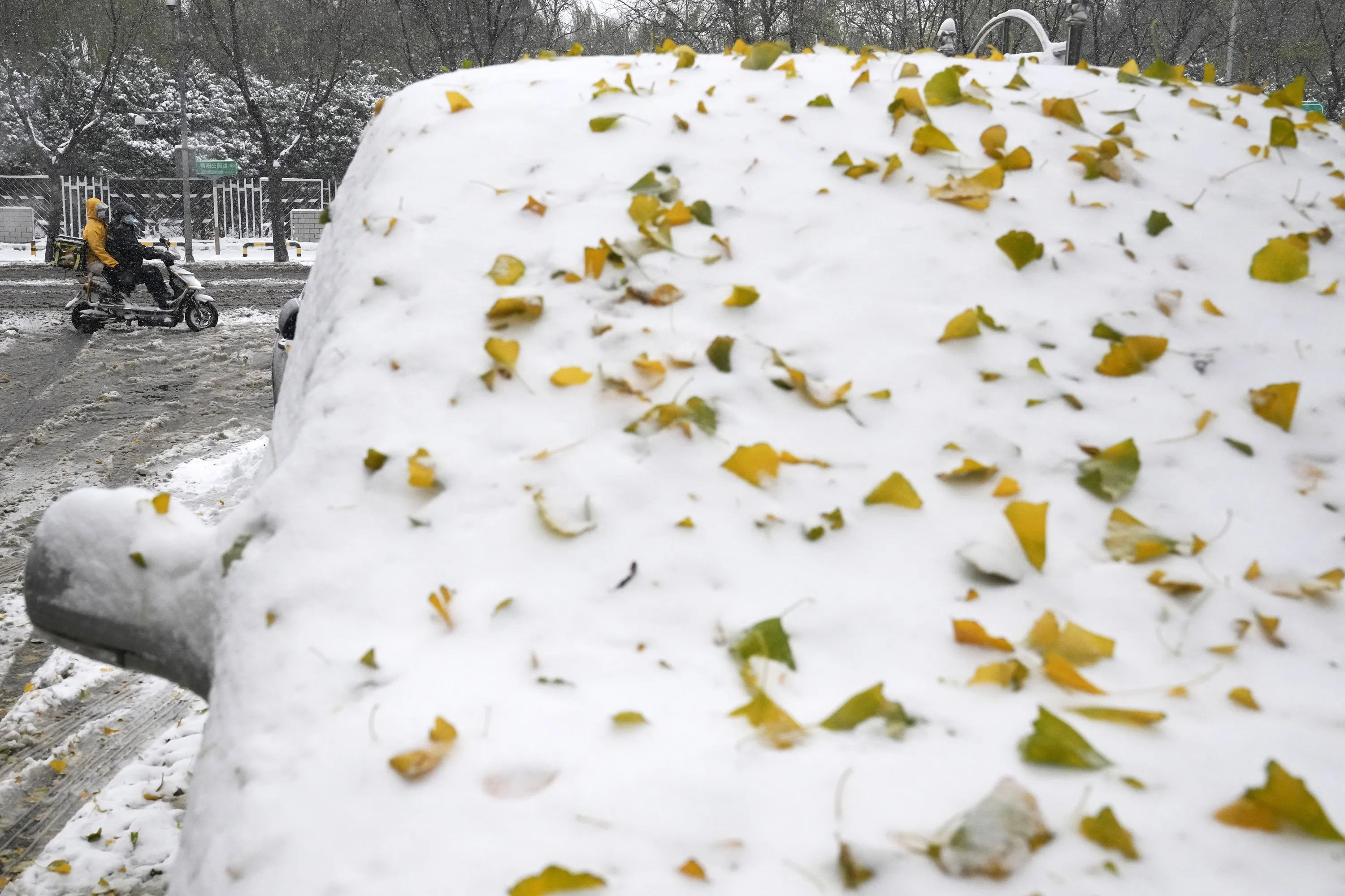 Residents past by a snow covered car in Beijing, China, Sunday, November 7, 2021. (Photo by Ng Han Guan/AP Photo)