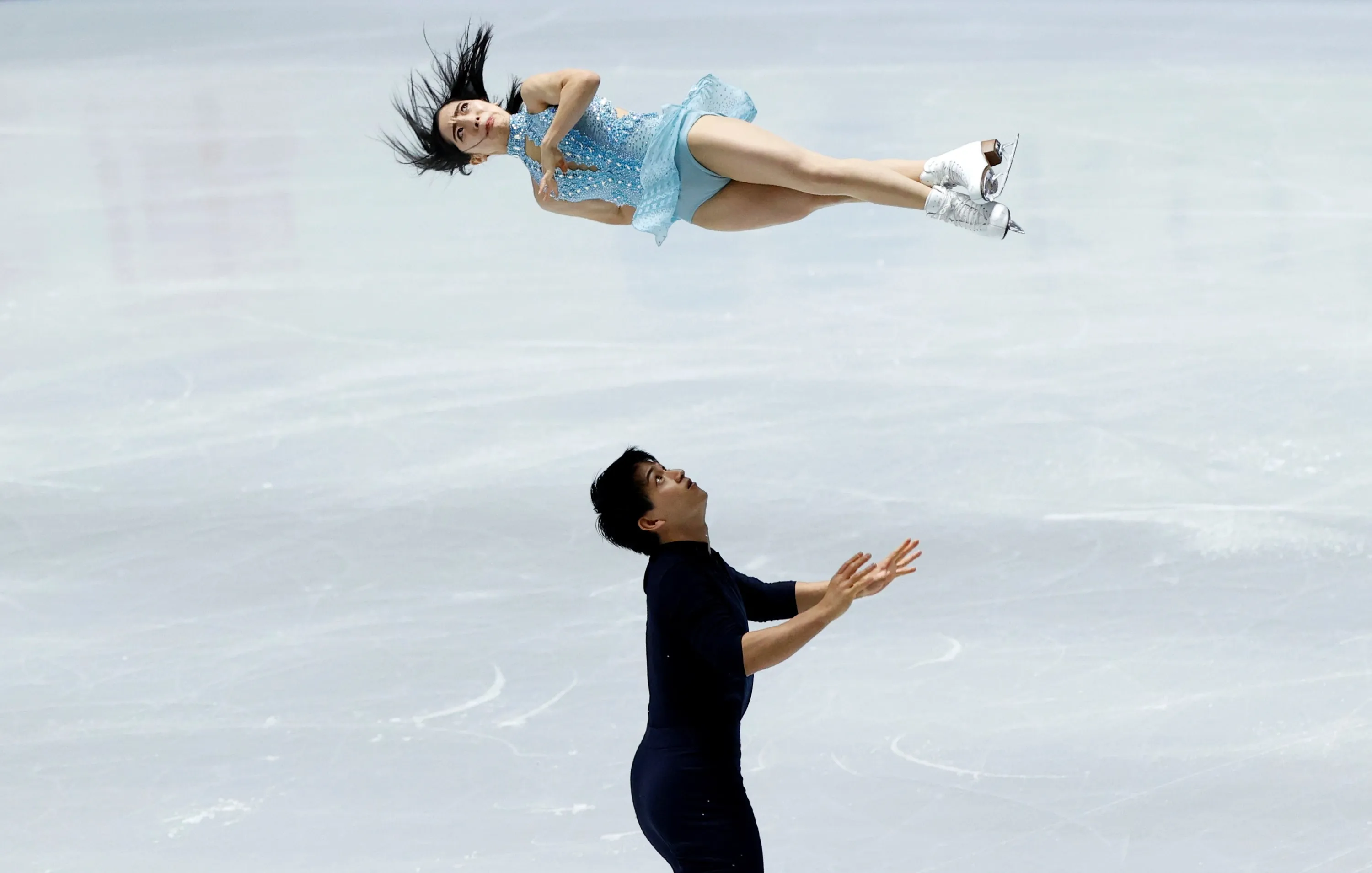 Japan's Riku Miura and Ryuichi Kihara compete in the pairs short program competition during the Grand Prix of Figure Skating NHK Trophy in Tokyo on November 12, 2021. (Photo by Issei Kato/Reuters)