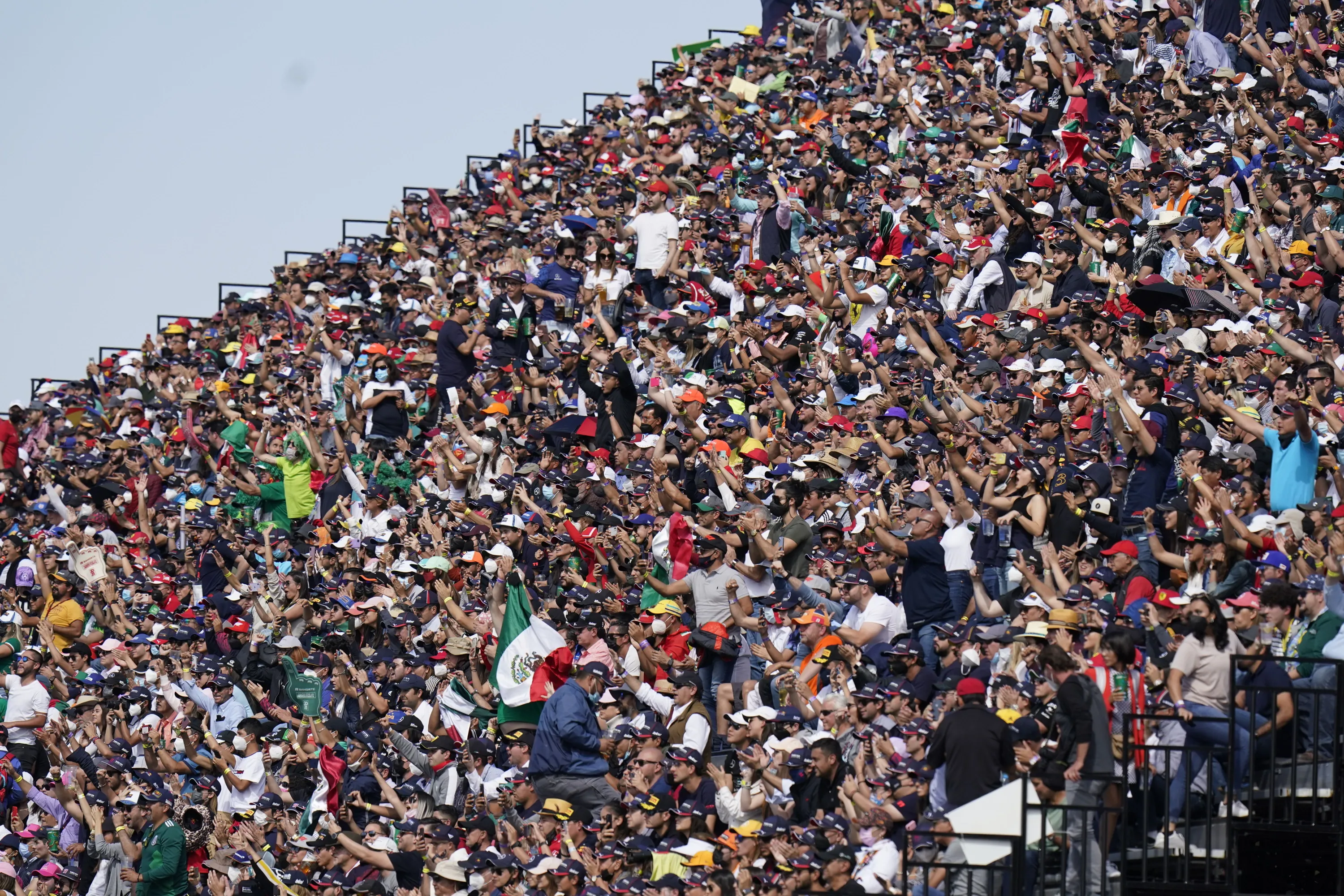 Fans cheers in the stands during the qualifying run of the Formula One Mexico Grand Prix auto race at the Hermanos Rodriguez racetrack in Mexico City, Saturday, November 6, 2021. (Photo by Eduardo Verdugo/AP Photo)