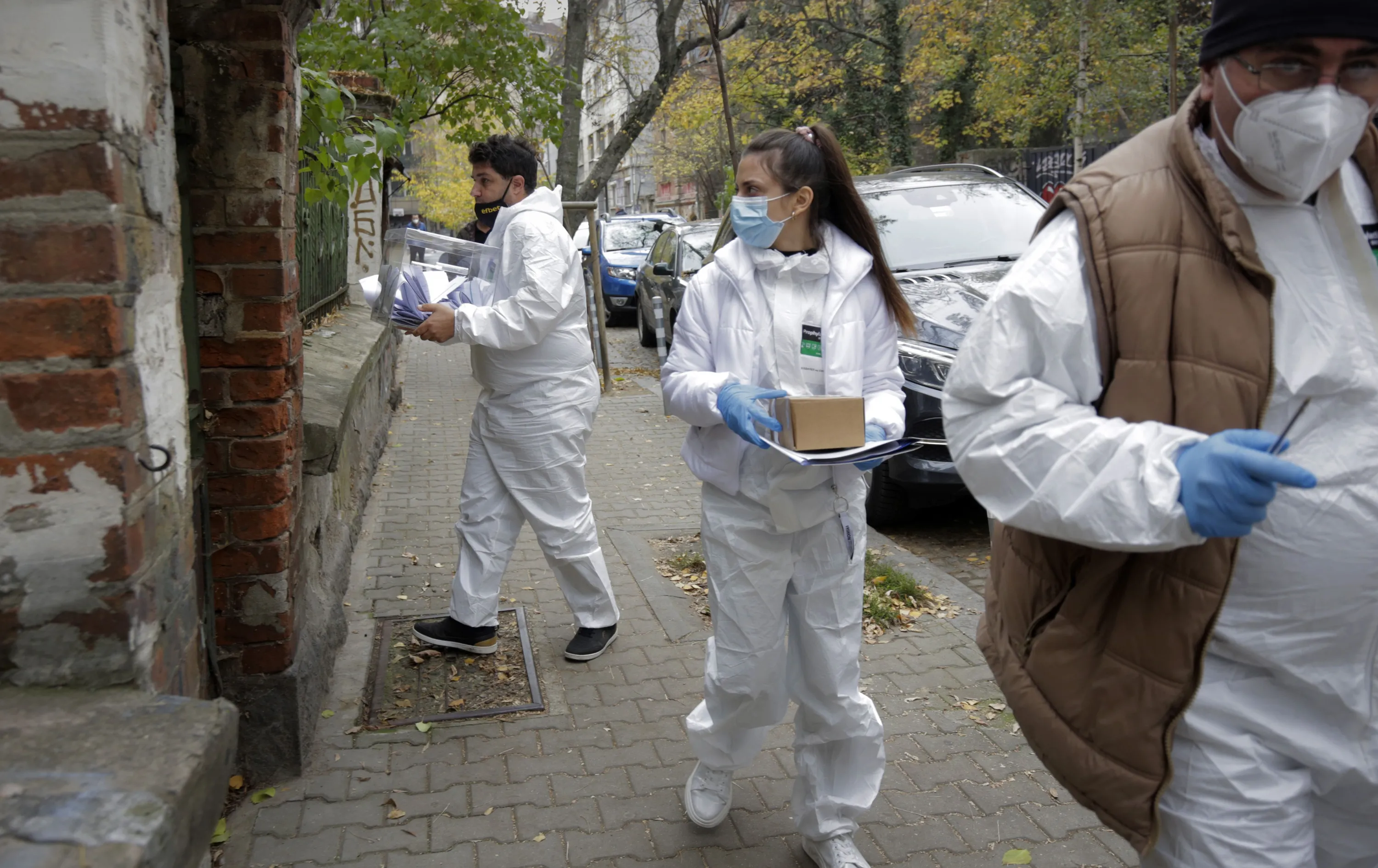 Election officers dressed in protective gear to protect from COVID-19 go to the addresses of sick people to allow them to cast their votes, in Sofia, Sunday, November 14, 2021. Bulgarians are heading to the polls to elect a new parliament and a new president amid a surge of coronavirus infections. Some 6.7 million eligible voters hope that after inconclusive general elections in April and July, the third attempt to elect 240 lawmakers will result in a government to lead the European Union’s poorest member out of health and economic crises. (Photo by Valentina Petrova/AP Photo)